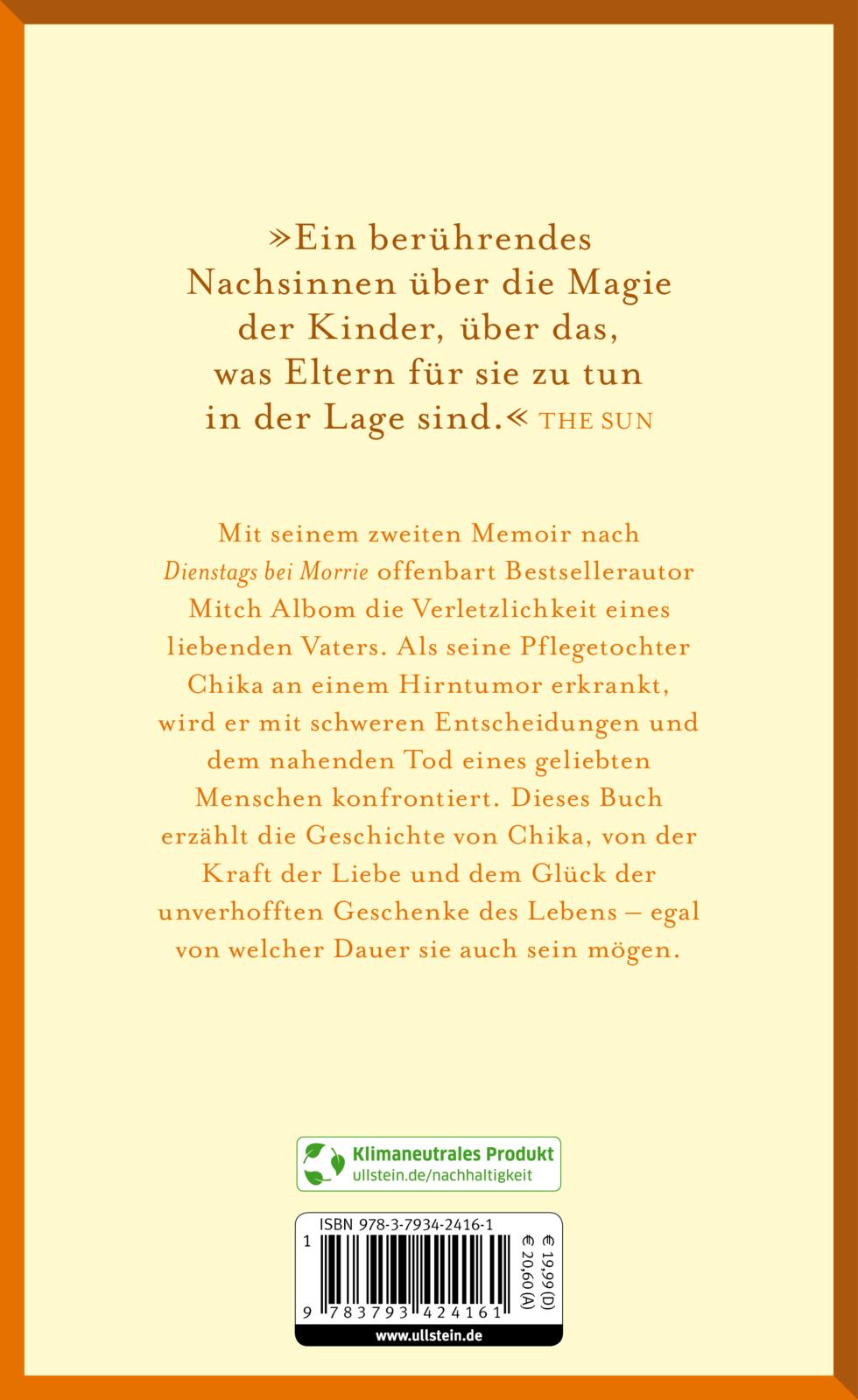 Chika Jeune, auf Haiti in das verheerende Erdbeben 2010 hineingeboren, wächst in dem Waisenhaus auf, das Mitch Albom dort gegründet hat. Mit ihrem unglaublich positiven, mutmachenden Wesen lässt sie niemanden unberührt. Im Alter von 5 Jahren wird bei ihr ein inoperabler Hirntumor festgestellt. Mitch und seine Frau Janine nehmen sie mit nach Detroit in der Hoffnung, Chika eines Tages geheilt zurück zu bringen. Auf ihrer Odyssee zu Spezialkliniken wird das Kind wie eine Tochter für das kinderlose Paar. Chikas grenzenloser Optimismus und unerschütterlicher Humor führen ihnen vor Augen, welches Glück ein so positives Wesen für das eigene Leben bedeutet. In berührenden Dialogen mit Chika gelingt Mitch Albom ein weiteres Meisterwerk.