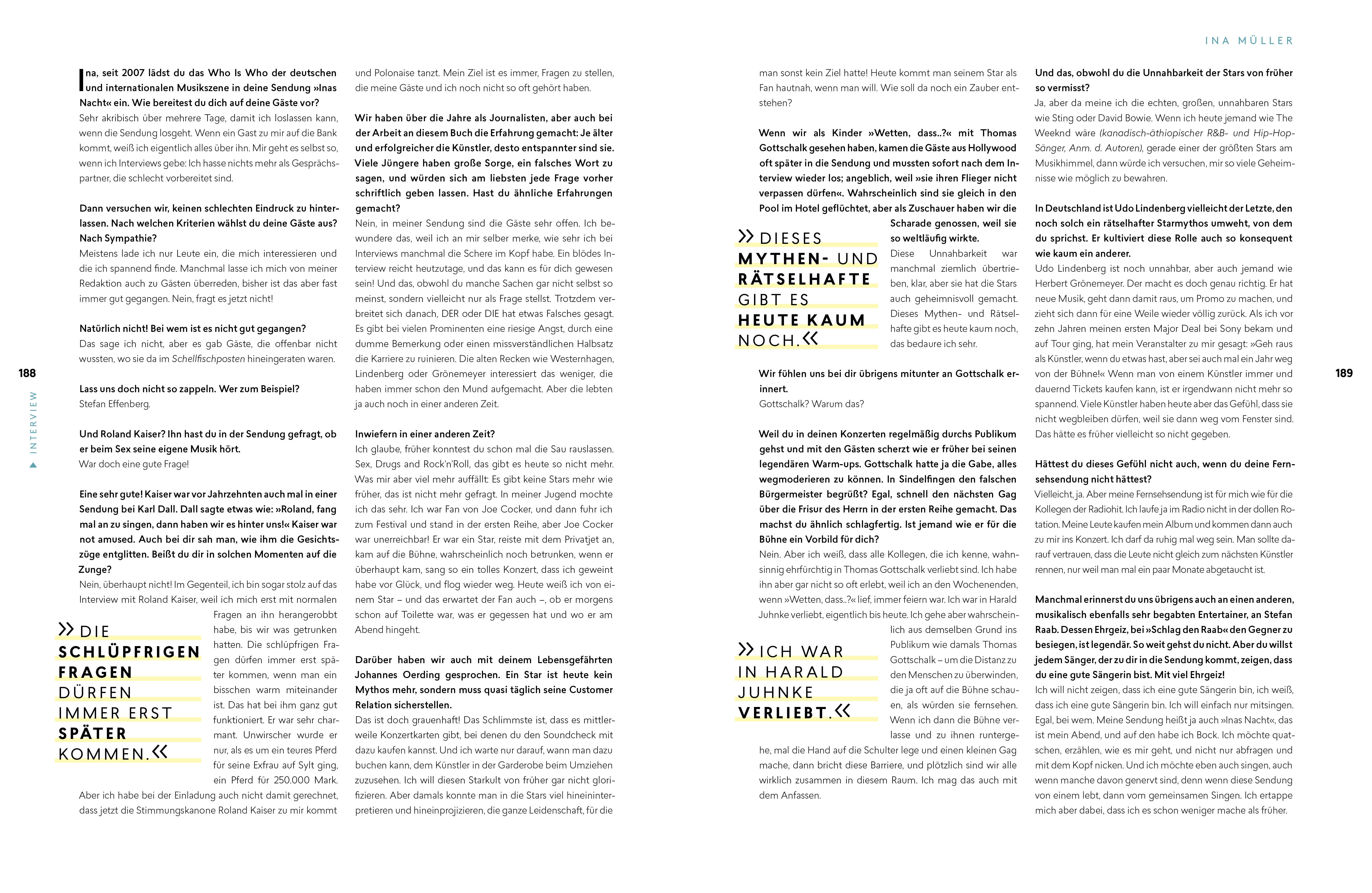 meine Gäste und ich noch nicht so oft gehört haben.« (Ina Müller) Das gelingt auch den Journalisten Georgi und Benninghoff. Bei Reinhard Mey, Fanta 4 und Klaus Meine, Moses Pelham, Marius Westernhagen und Smudo: Überall finden sich neue Aspekte. Und gute Porträts des Fotografen Daniel Pilar."