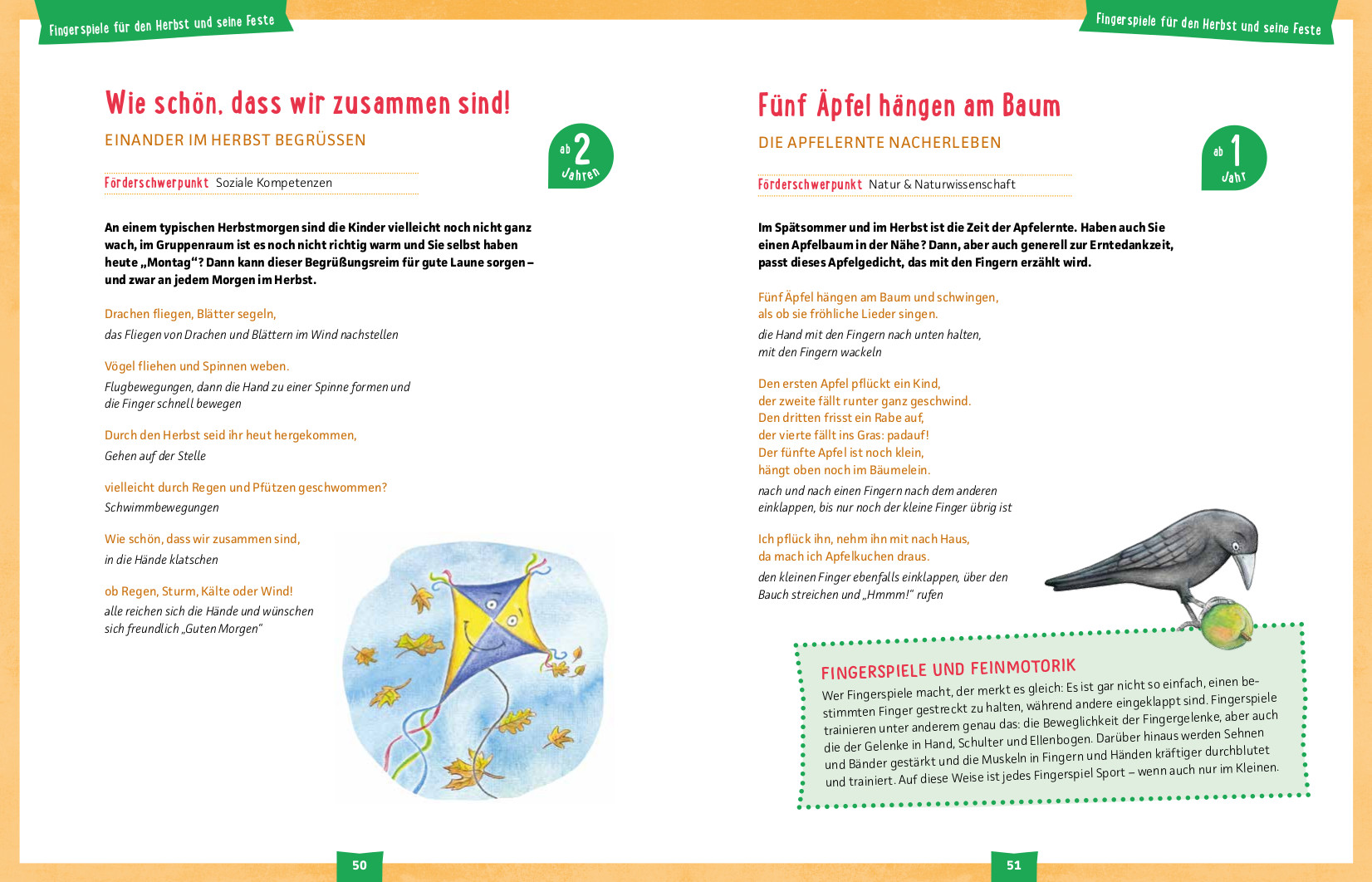 - Das Fachbuch orientiert sich zu einem großen Teil an den Jahreszeiten: Fingerspiele passend zu Frühling, Sommer, Herbst und Winter und auch den entsprechenden Festen (Oster, Erntezeit, Halloween, Sankt Martin, Nikolaus, Advent und Weihnachten).