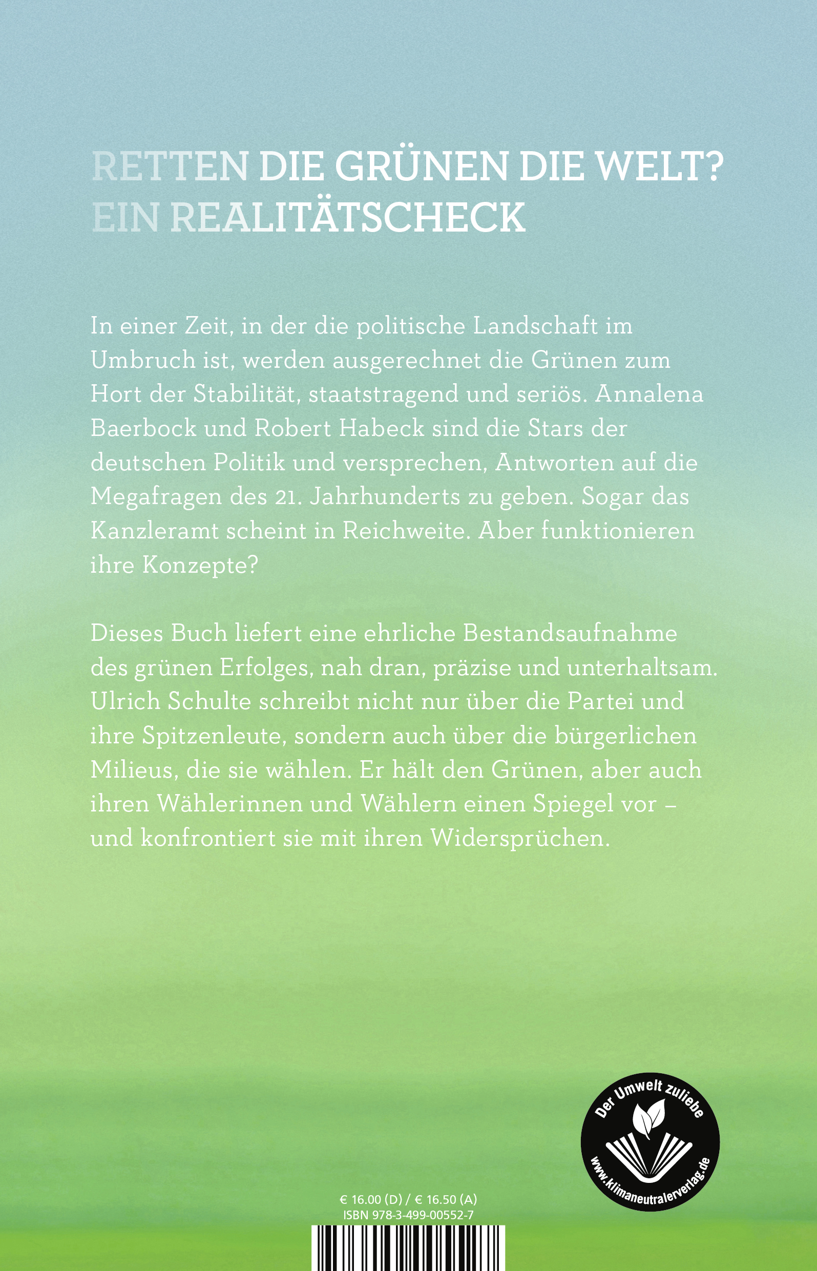 Dieses Buch liefert eine Bestandsaufnahme des grünen Erfolges, nah dran, präzise und unterhaltsam. Der Grünenkenner Ulrich Schulte schreibt nicht nur über die Partei und ihr erfolgreiches Personal, sondern auch über die bürgerlichen Milieus, die sie wählen. Er hält den Grünen, aber auch ihren Wählerinnen und Wählern einen Spiegel vor - und konfrontiert sie mit ihren Widersprüchen.