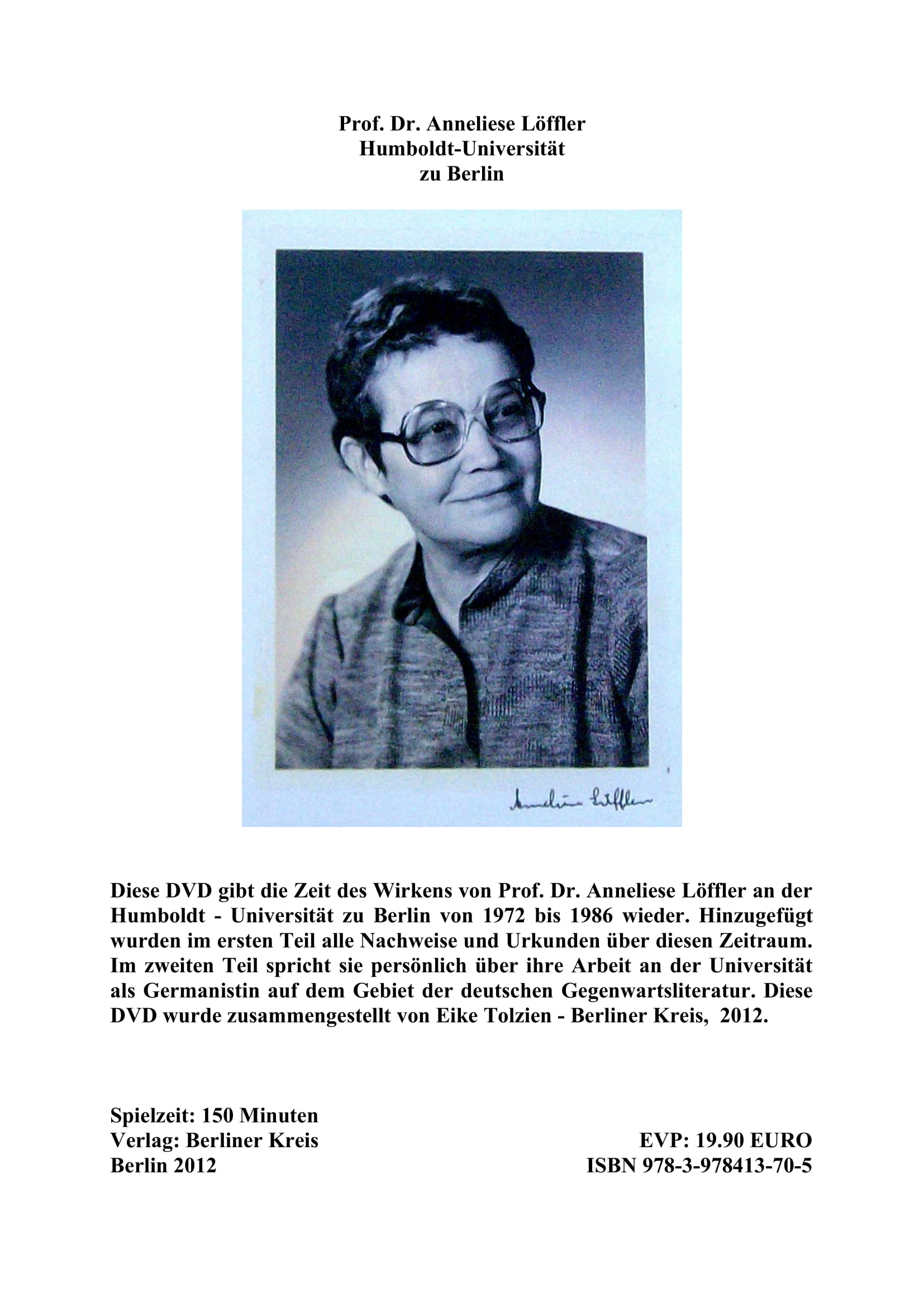 Anneliese Löffler, vormals Große (* 7. Mai 1928 in Folbern ), ist eine deutsche Germanistin und Literaturwissenschaftlerin. Im Jahr 1971 wurde Löffler Mitglied des Berliner Schriftstellerverbandes, in dem sie zeitweilig Vorstandsmitglied des Berliner Bezirksverbands war. Im Jahr 1972 erhielt sie Professur für DDR-Literatur an der Humboldt-Universität zu Berlin. Seit dem Jahr 2011 sind viele Bücher, Hörbücher, DVDs und CD-ROMs von ihr erschienen. Während ihrer wissenschaftlichen Tätigkeit hat sich mit der Zeit viel Material angesammelt, das sie nun veröffentlicht. Vorher war dafür keine Zeit übrig-sie diente allein der Wissenschaft. Andere Vermutungen und anonyme abfällige Äußerungen über sie-wie z, B. in wikipedia- sind erstunken und erlogen. In Wikipedia steht z. B. eingetragen: Bis mindestens 2011 war sie in der Berliner Amateur- und semiprofessionellen Literaturszene als Kritikerin aktiv.[8] Richtigstellung: Sie war in der Kiezspinne-Lichtenberg nie als Kritikerin tätig sondern als Herausgeberin von Büchern! Etwas gegenteiliges ist erstunken und erlogen! Zwischen 2017 und 2020 sind mehr als 20 Buchveröffentlichungen im Eigenverlag mit Anneliese Löffler als Mitautorin erschienen.[9] Auch das stimmt nicht: Anneliese Löffler hat zwischen 2011 und 2020 alle ihre Aufzeichnungen über den Verlag: Berliner Kreis veröffentlicht und nicht im Eigenverlag. Etwas gegenteiliges ist erstunken und erlogen!