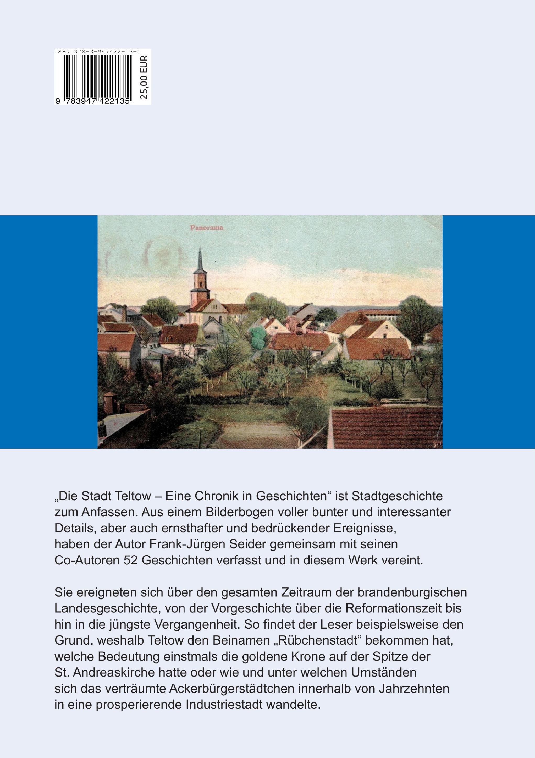 hin in die jüngste Vergangenheit. So findet der Leser beispielsweise den Grund, weshalb Teltow den Beinamen Rübchenstadt“ bekommen hat, welche Bedeutung einstmals die goldene Krone auf der Spitze der St. Andreaskirche hatte oder wie und unter welchen Umständen sich das verträumte Ackerbürgerstädtchen innerhalb von Jahrzehnten in eine prosperierende Industriestadt wandelte.