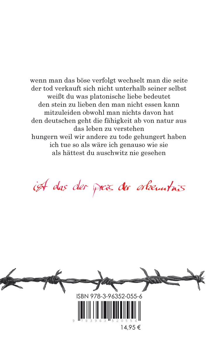 wenn man das böse verfolgt wechselt man die seiteder tod verkauft sich nicht unterhalb seiner selbstweißt du was platonische liebe bedeutetden stein zu lieben den man nicht essen kannmitzuleiden obwohl man nichts davon hatden deutschen geht die fähigkeit ab von natur ausdas leben zu verstehenhungern weil wir andere zu tode gehungert habenich tue so als wäre ich genauso wie sieals hättest du auschwitz nie gesehen"ist das der preis der erkenntnis?"