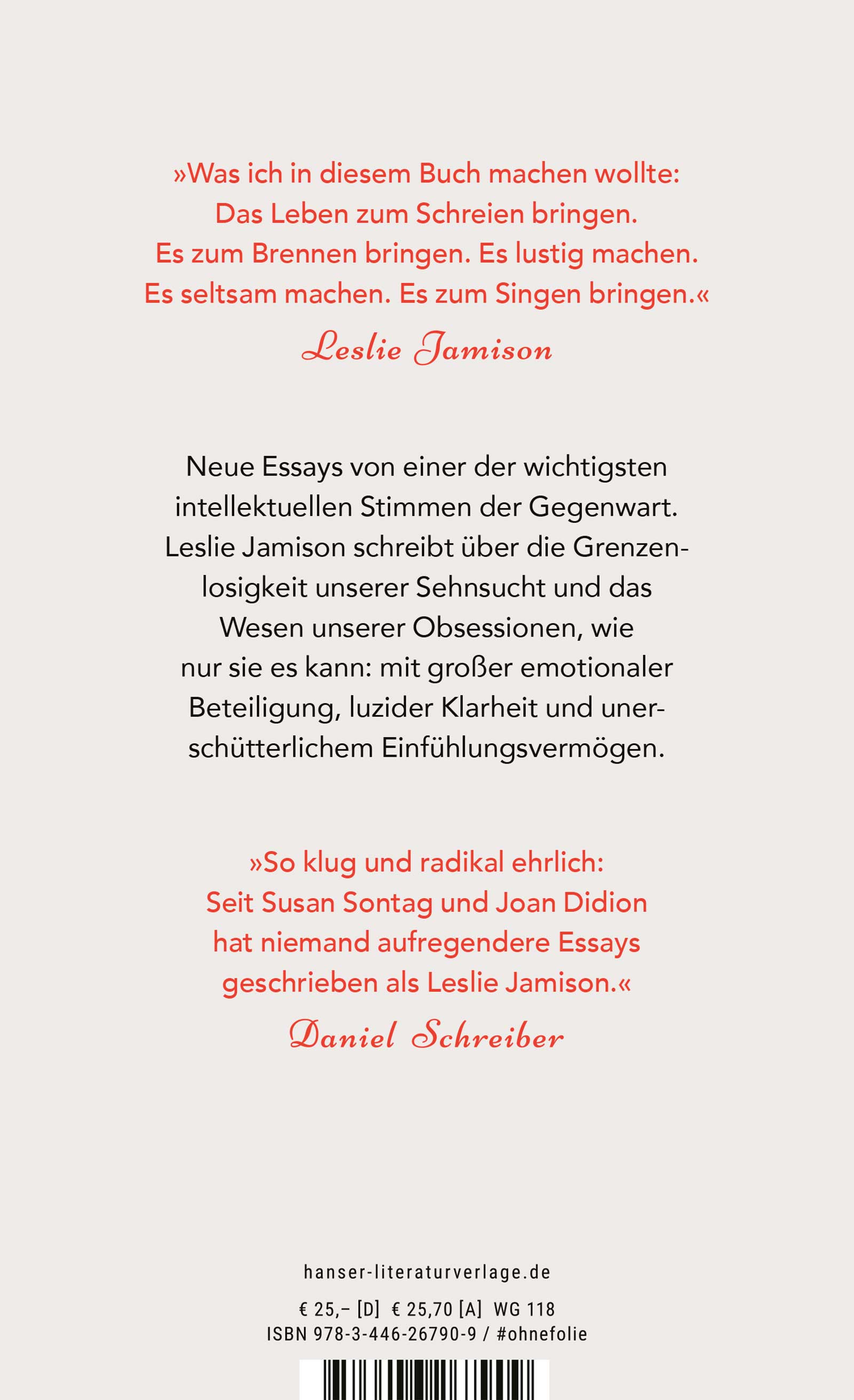Leslie Jamison ist eine der originellsten und couragiertesten Denkerinnen ihrer Generation. „So klug und radikal ehrlich: Seit Susan Sontag und Joan Didion hat niemand aufregendere Essays geschrieben als Leslie Jamison.“ Daniel Schreiber