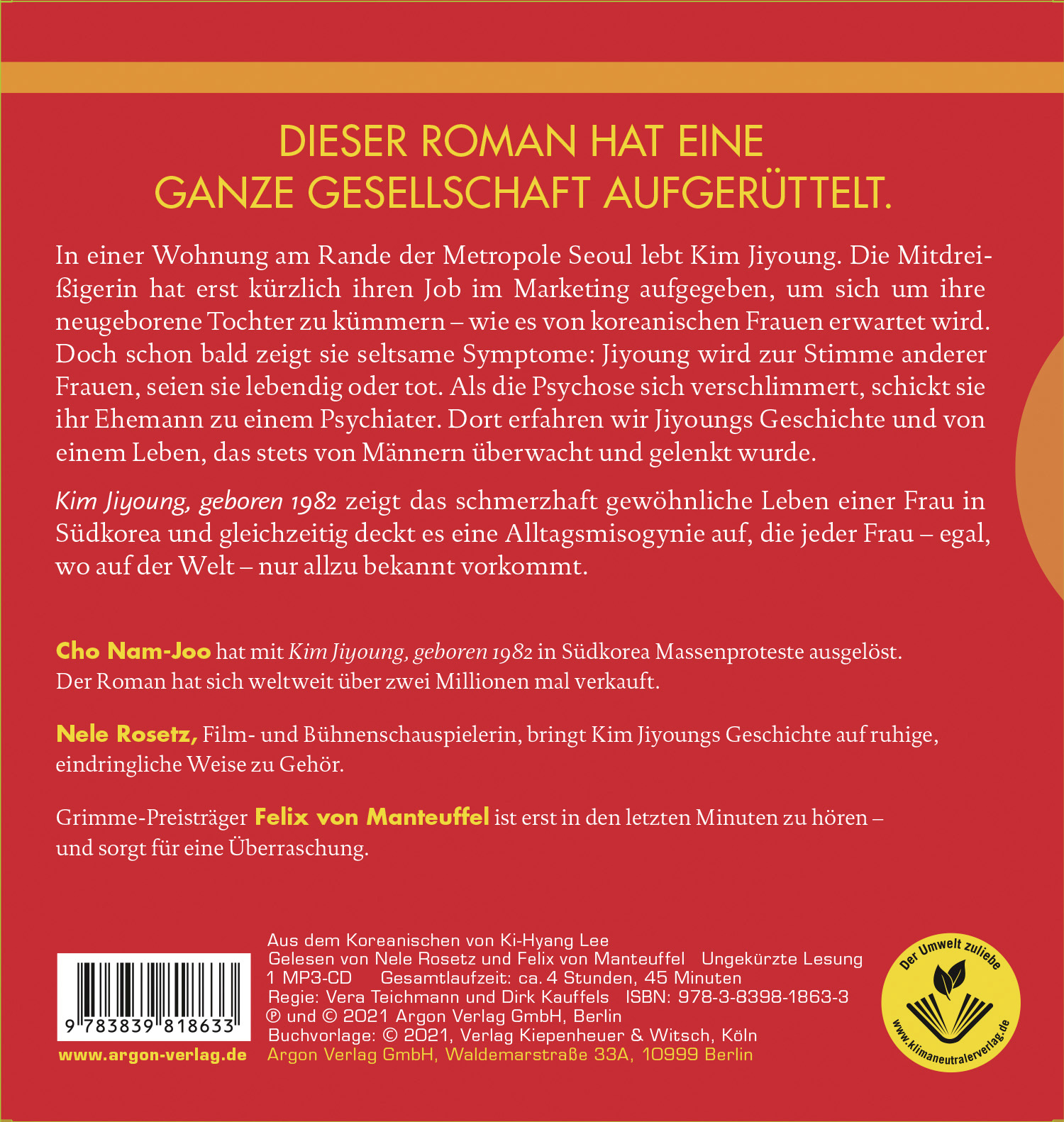 Der internationale Bestseller aus Südkorea zeigt die junge Frau Kim Jiyoung auf ihrem Weg zur Emanzipation in einer von Ungleichheit und Frauenfeindlichkeit geprägten Gesellschaftsordnung. Cho Nam-joos Roman, eindringlich gelesen von Nele Rosetz und Felix von Manteuffel, erzählt das Schicksal einer Mittdreißigerin, die in einer kleinen, aufgeräumten Wohnung am Rande der Metropole Seoul lebt und zunehmend unter psychischen Störungen leidet.