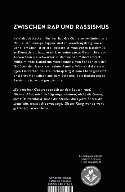 Manuellsen, 1979 geboren in Berlin-Kreuzberg als Sohn einer ghanaischen Aktivistin, gehört seit über einem Jahrzehnt zu den Protagonisten des Deutschrap. Wenn es eine Konstante in seinem Leben gibt, dann den Wandel: schwarzes Adoptivkind in einer weißen Ruhrpott-Familie, Konvertierung zum Islam, Lichtgestalt des Rap, Rockerclub-Anhänger, Balladen-Sänger. Aber vor allem: die lauteste Stimme gegen Rassismus im deutschen Hiphop.