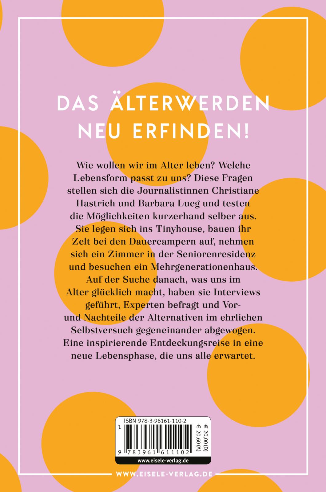 Wie wollen wir im Alter leben? Welche Lebensform passt zu uns? Diesen Fragen stellen sich die Journalistinnen Christiane Hastrich und Barbara Lueg und testen die Möglichkeiten kurzerhand selber aus. Sie legen sich ins Tinyhouse, bauen ihr Zelt bei den Dauercampern auf, nehmen sich ein Zimmer in der Seniorenresidenz und besuchen ein Mehrgenerationenhaus. Auf der Suche danach, was uns im Alter glücklich macht, haben sie Interviews geführt, Experten befragt und Vor- und Nachteile der Alternativen im ehrlichen Selbstversuch gegeneinander abgewogen. Eine inspirierende Entdeckungsreise in eine neue Lebensphase, die uns alle erwartet. Und in der wir uns neu erfinden können, statt einsam lieber gemeinsam!