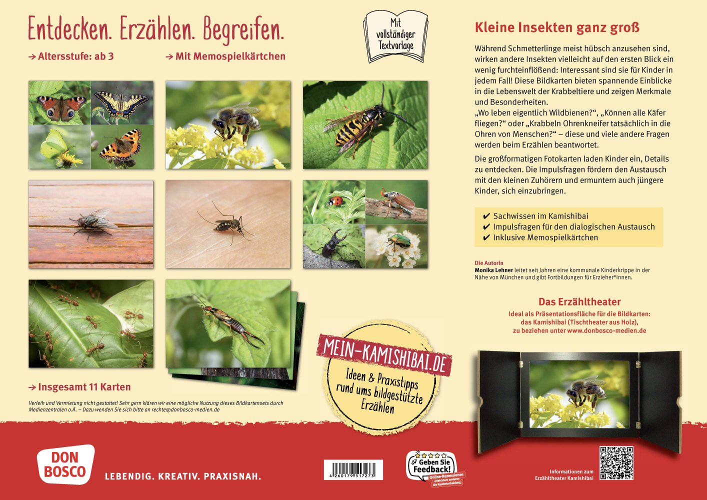 Schmetterlinge finden alle Kinder schön, Ohrenkneifer nicht unbedingt: Die Welt der Insekten ist ebenso spannend wie abwechslungsreich. Mit dem Bildkartenset für das Erzähltheater und dem dazu passenden Memo-Spiel werden Wissensvermittlung und Spielen kombiniert. So lernen alle gerne mehr über die faszinierende Welt der Krabbeltiere!