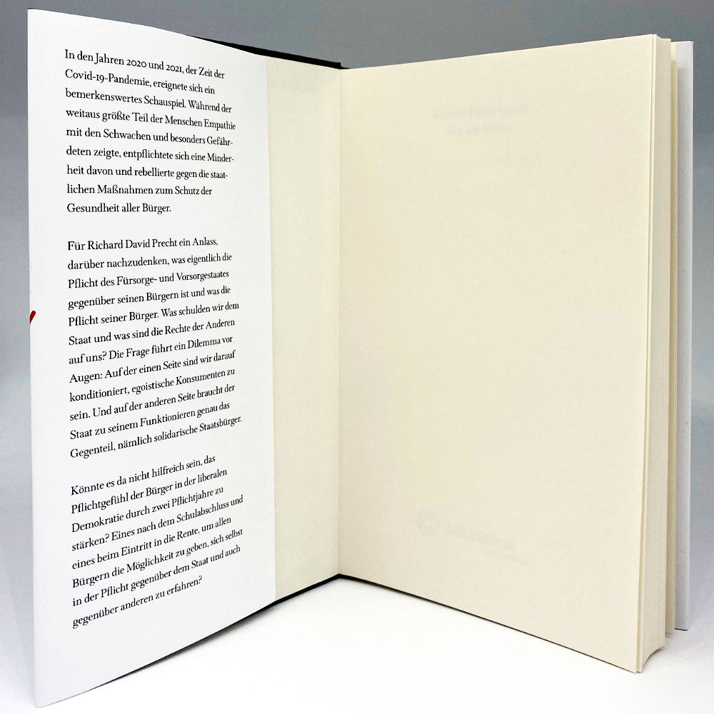In den Jahren 2020 und 2021, der Zeit der Covid-19-Pandemie, ereignete sich ein bemerkenswertes Schauspiel. Während der weitaus größte Teil der Menschen Empathie mit den Schwachen und besonders Gefährdeten zeigte, entpflichtete sich eine Minderheit davon und rebellierte gegen die staatlichen Maßnahmen zum Schutz der Gesundheit aller Bürger.Für Richard David Precht ein Anlass, darüber nachzudenken, was eigentlich die Pflicht des Fürsorge- und Vorsorgestaates gegenüber seinen Bürgern ist und was die Pflicht seiner Bürger. Was schulden wir dem Staat und was sind die Rechte der Anderen auf uns? Die Frage führt ein Dilemma vor Augen: Auf der einen Seite sind wir darauf konditioniert, egoistische Konsumenten zu sein. Und auf der anderen Seite braucht der Staat zu seinem Funktionieren genau das Gegenteil, nämlich solidarische Staatsbürger. Könnte es da nicht hilfreich sein, das Pflichtgefühl der Bürger in der liberalen Demokratie durch zwei Pflichtjahre zu stärken? Eines nach dem Schulabschluss und eines beim Eintritt in die Rente, um allen Bürgern die Möglichkeit zu geben, sich selbst in der Pflicht gegenüber dem Staat und auch gegenüber anderen zu erfahren?