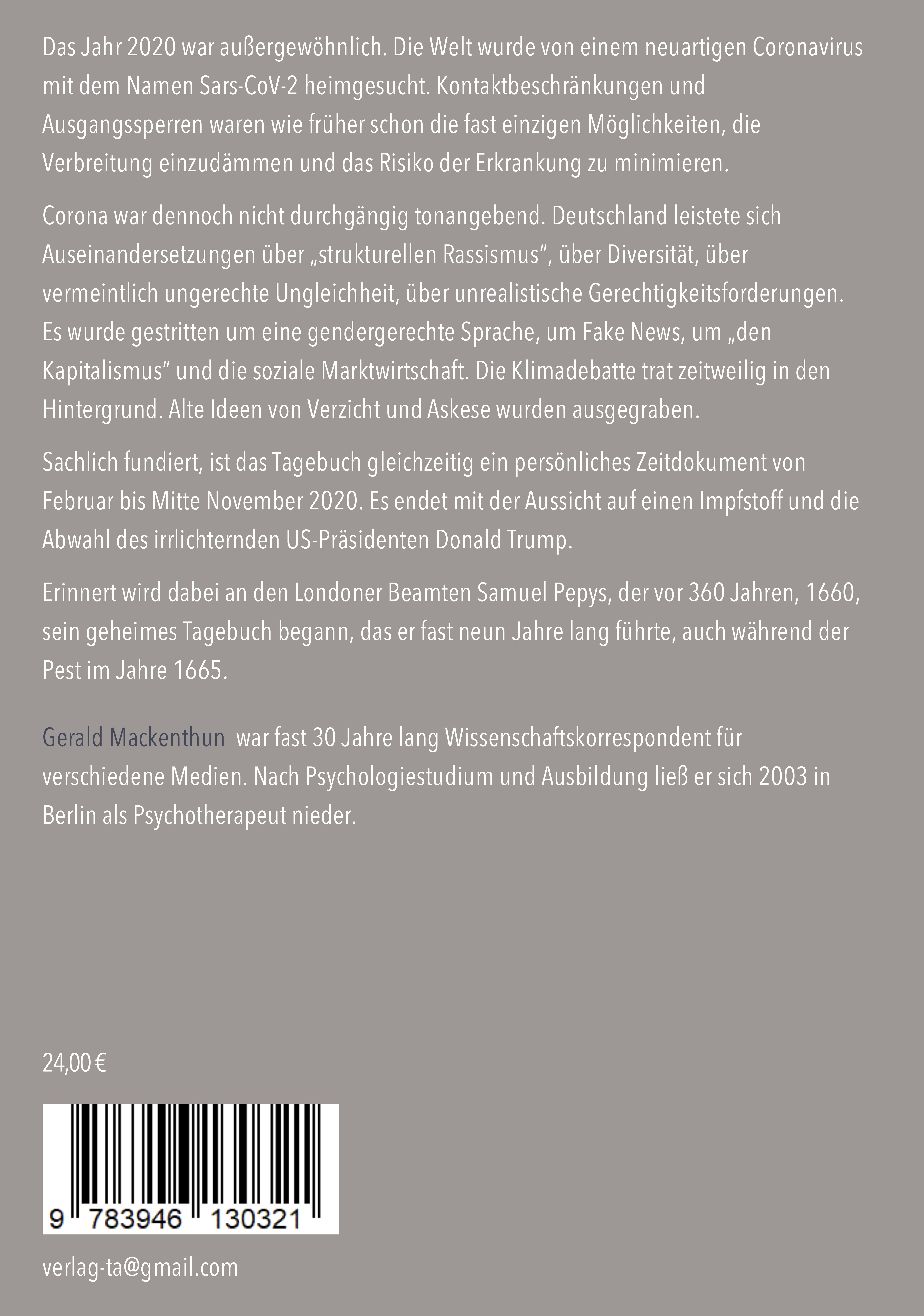 Corona war dennoch nicht durchgängig tonangebend. Deutschland leistete sich zeitgleich einige bizarre Auseinandersetzungen über angeblich „strukturellen Rassismus“, über Diversität, über vermeintlich ungerechte Ungleichheit, über unrealistische Gerechtigkeitsforderungen. Wir erlebten fortgesetzte Versuche, eine mutmaßlich gendergerechte Sprach- und Schreibweise ebenso wie Fake News durchzudrücken sowie „den Kapitalismus“ und die soziale Marktwirtschaft zu diskreditieren. Trat die Klimadebatte zunächst in den Hintergrund, wurde sie in der zweiten Jahreshälfte erneut aufgegriffen. Alte Ideen von Verzicht und Askese wurden ausgegraben. Sachlich fundiert, ist das Tagebuch gleichzeitig ein persönliches Zeitdokument von Februar bis Mitte November 2020. Das Tagebuch endet mit der Aussicht auf einen Impfstoff und die Abwahl des irrlichternden US-Präsidenten Donald Trump. So ergibt das Tagebuch ein Panoptikum an Ideen und Streitgesprächen, die uns im Jahr 2020, als Corona das öffentliche Leben lahmlegte, beschäftigte. Trotz Sars-CoV-2: Die Menschheit wird im Wesentlichen weitermachen wie bisher.