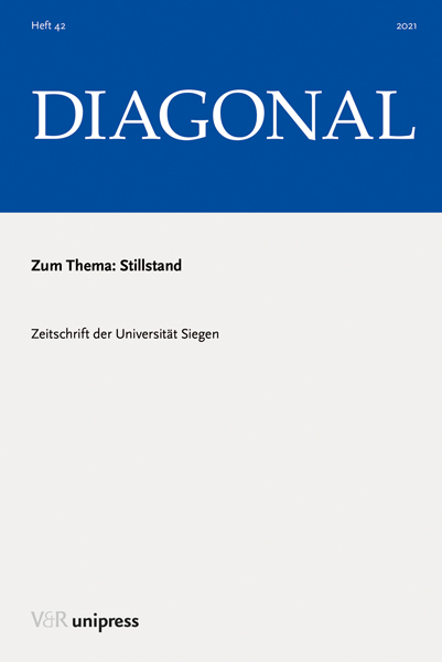 Unsere Welt ist durch Tempo, Fortschrittsstreben und ein »Immer-Weiter« geprägt. Stillstand, von dem es heißt, er sei Rückschritt, passt hier auf den ersten Blick so gar nicht hinein: Geht es doch nicht nur um die bewusste Verlangsamung einer Dynamik, sondern um deren Unterbrechung. Insbesondere ein »verordneter« Stillstand infolge der Corona-Pandemie hat ein bislang unbeachtetes Thema in den Vordergrund gerückt. Doch schauen wir uns aufmerksam um: Stillstand - teils erwünscht, teils unerwünscht oder gar unvermeidlich - geschieht durchaus häufiger, als wir es wahrnehmen. DIAGONAL 2021 spürt dem Stillstand in Kunst und Kultur, Wirtschaft und Gesellschaft, Erziehung und Bildung nach.Our world is driven by speed, pursuit for progress and an attitude "to always go a step further". Standstill which is perceived as a step backwards does not really fit in here at first glance. Since it is not about the deliberate deceleration of a dynamic but its interruption. Particularly, an "enacted" standstill due to the Corona pandemic has brought a hitherto unnoticed subject into the spotlight. However, a standstill - in parts desired, in parts not or even inevitable - happens much more often than we perceive. DIAGONAL 2021 focuses on standstill in art and culture, economy and society, and education and teaching.