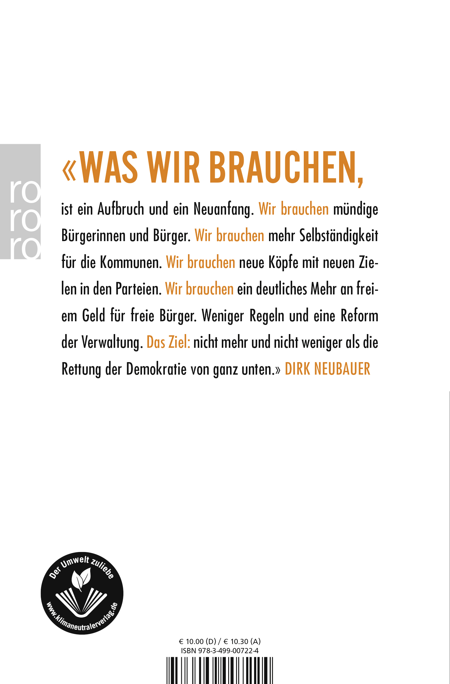 Dirk Neubauer, der Bürgermeister der sächsischen Stadt Augustusburg, will unser politisches System umbauen. Denn: Die Demokratie erreicht die Menschen nicht mehr. Das will Neubauer ändern. Sein Weg aus der Krise: das System vom Kopf auf die Füße stellen, die Hierarchie von Bund, Ländern, Kreisen und Kommunen radikal aufbrechen, die Rolle von Parteien hinterfragen und alles, was geht, vor Ort entscheiden - durch die direkte Beteiligung von Bürgern. Dass dies möglich ist, haben er und seine Stadt bewiesen. Ein Buch, das aufrüttelt.