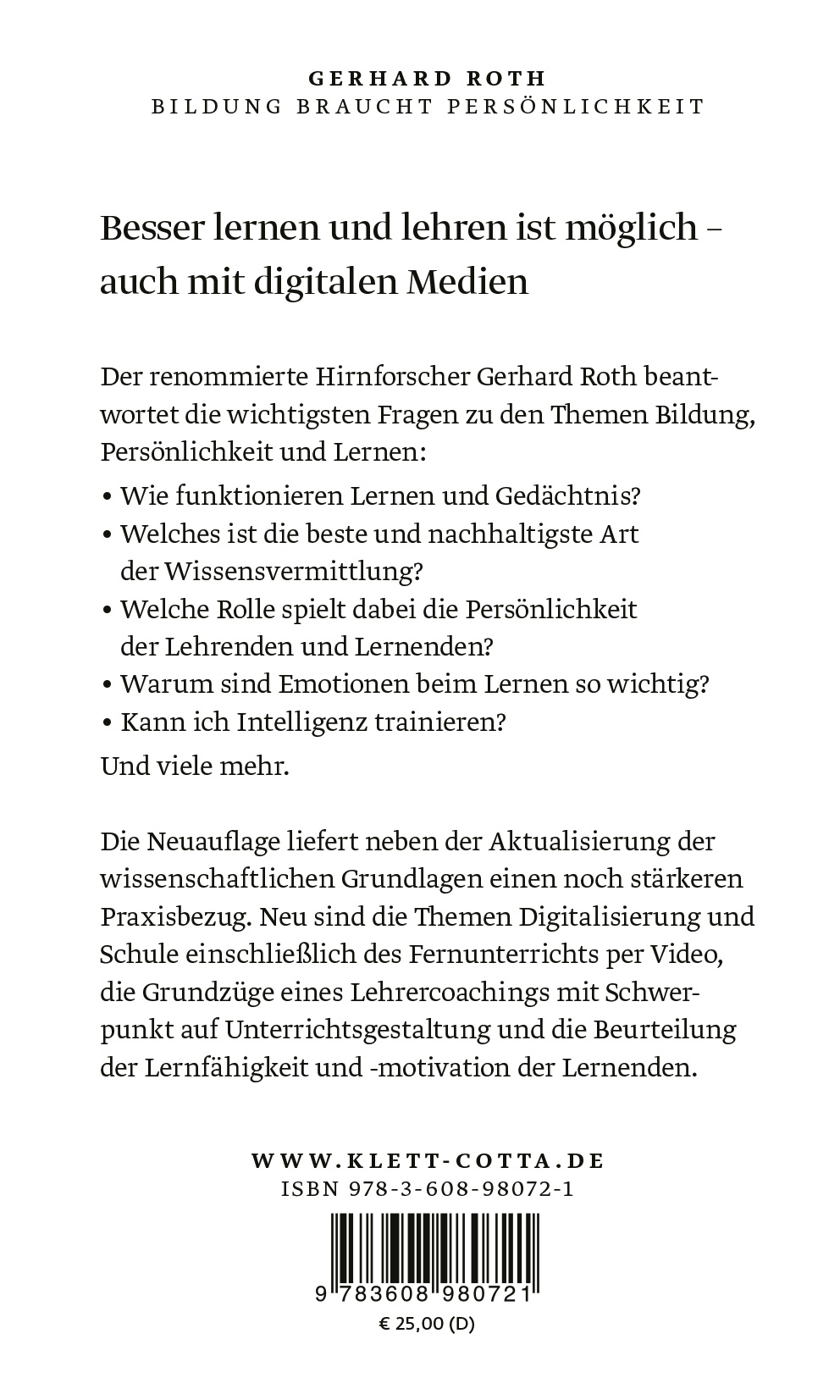 Der Bestsellerautor Gerhard Roth beantwortet die wichtigsten Fragen zu den Themen Bildung, Persönlichkeit und Lernen. Die Neuauflage liefert neben der Aktualisierung der wissenschaftlichen Grundlagen einen noch stärkeren Praxisbezug. Neu sind die Themen: