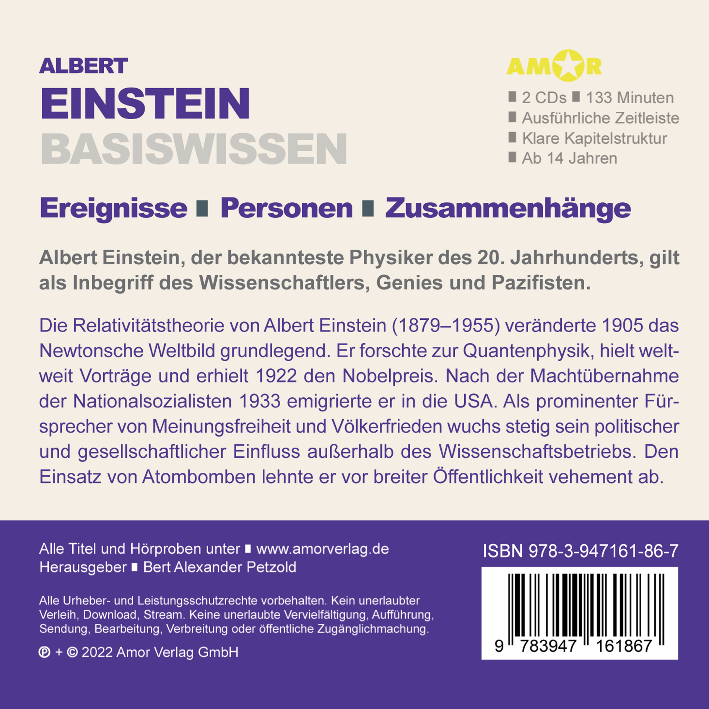 | Schlagworte | Abiturwissen • Albert Einstein • Allgemeinwissen • Amor Verlag • Atombombe • Basiswissen • Bert A. Petzold • Bildung • Biografie • Cora Hillekamp • Exil • Grundkenntnisse • Hitler • Hörbuch • Juden • Kompaktwissen • Lesung • Nationalsozialismus • René Wagner • Verfolgung • Weltkrieg • Wiederstand |