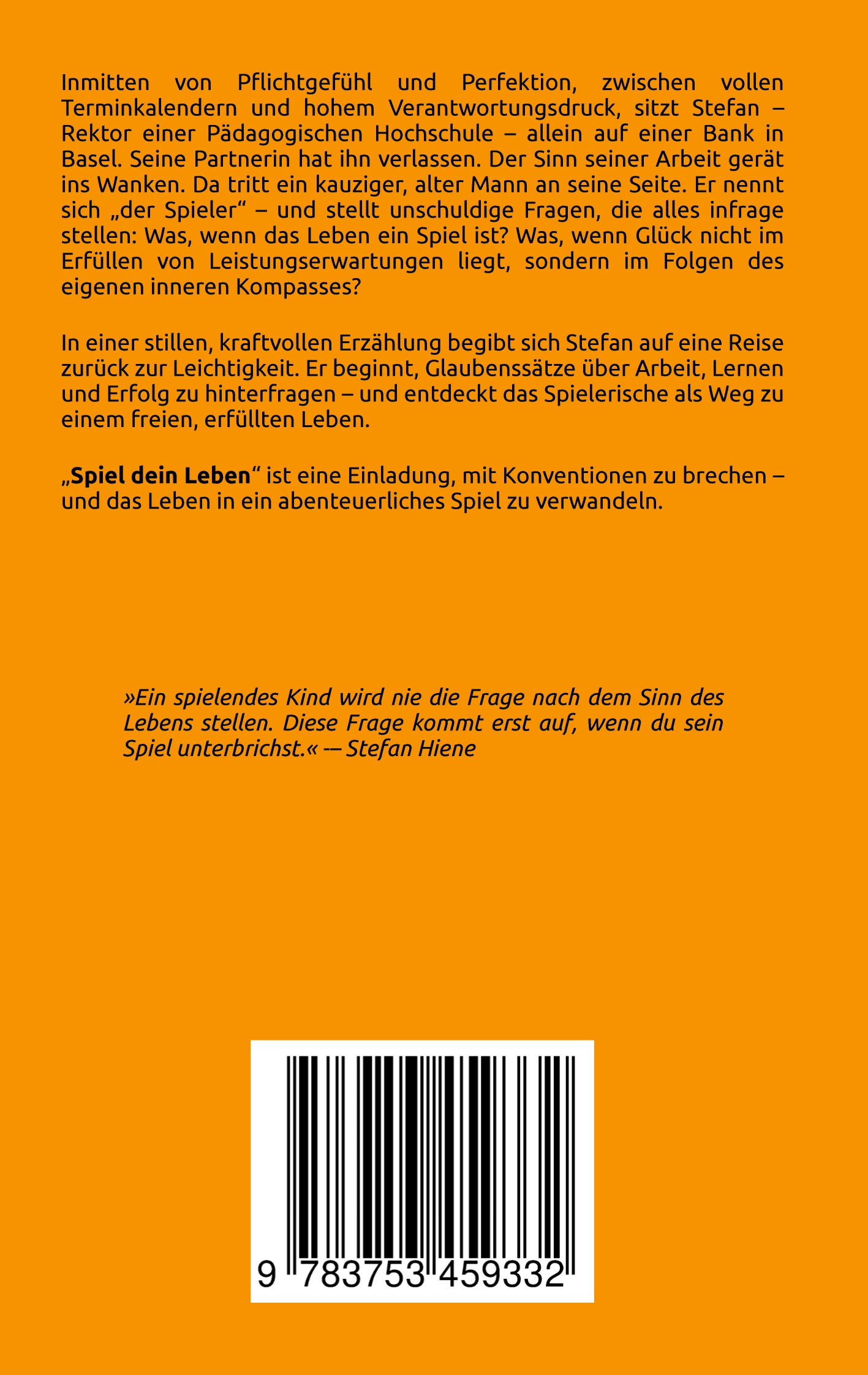Spielen? Wie sollte ihm das weiterhelfen? Stefan runzelt verwirrt die Stirn, während er mit einem alten Mann auf einer Parkbank sitzt. Wieso erzählte ihm dieser merkwürdige Kauz, der sich der Spieler nannte, etwas davon, dass er spielen sollte, um glücklich zu werden? Dadurch liess sich das Geschehene nicht ungeschehen machen.Er wünschte sich, er hätte mehr Zeit für Barbara gehabt: um gemeinsame Dinge zu planen, um eine Familie zu gründen, um miteinander glücklich zu sein. Aber was sollte er machen? Als Rektor einer Pädagogischen Hochschule war er nun mal stark eingespannt und hatte eine enorme Verantwortung - er bildete die Menschen aus, die Kinder auf deren Leben vorbereiten sollten.Irritiert und verzweifelt verlässt Stefan den Spieler, nur um kurze Zeit später festzustellen, dass der seltsame Kauz irgendwas in ihm geweckt hatte. Und so tragen ihn seine Füsse immer wieder zu ihm. Nach und nach führt der Spieler ihn an eine andere Sichtweise über das Lernen und Arbeiten heran - eine Sichtweise, die ihn zunächst verstört, dann aber immer mehr in den Bann zieht und letztlich sein Leben komplett auf den Kopf stellt.Eine befreiende Erzählung - voller Humor und Leichtigkeit - für Menschen, die in das natürliche Spiel ihres Lebens zurückkehren möchten, jenseits von Geld verdienen, Karriere und Konsum.