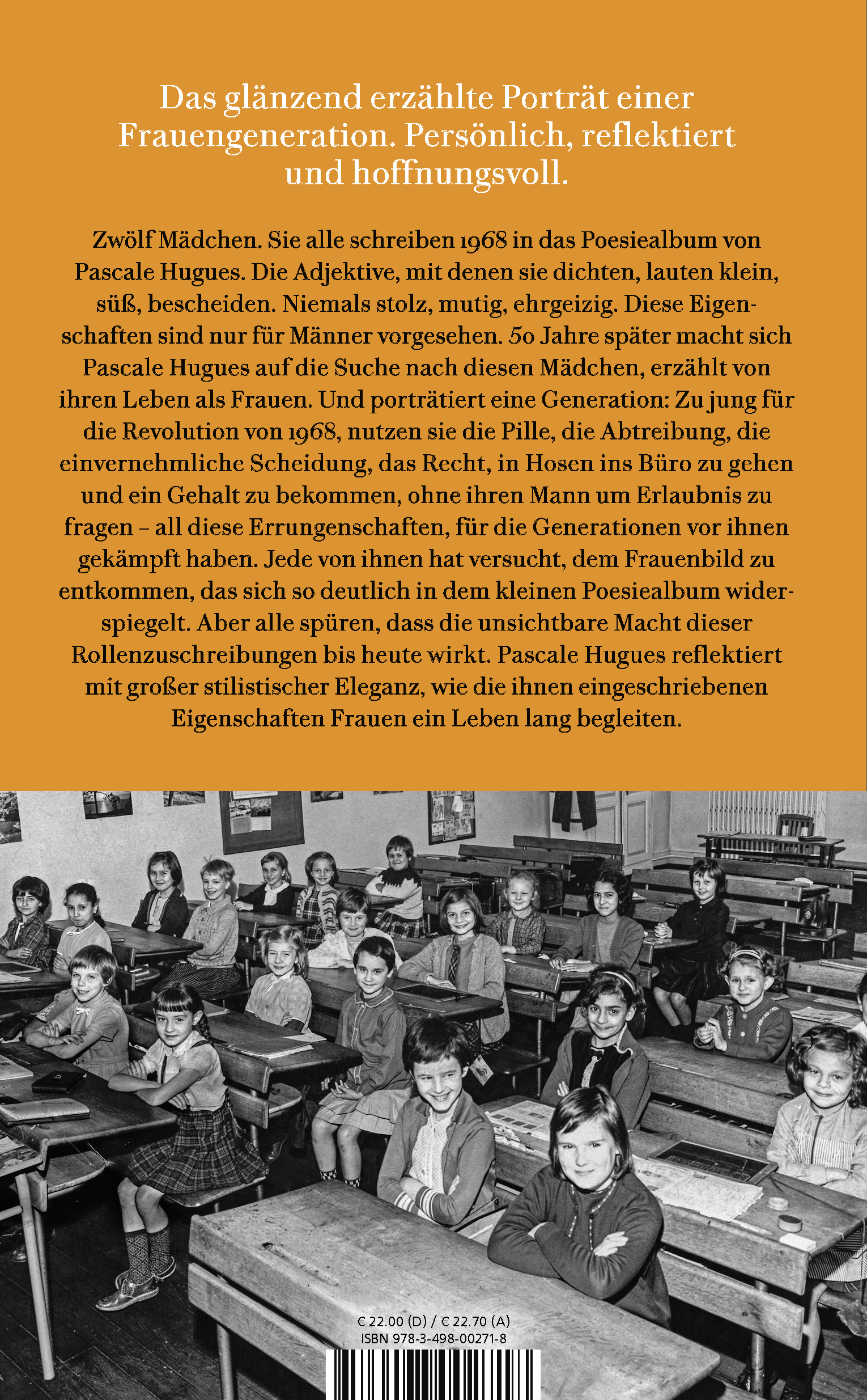 Zwölf Mädchen. Sie alle schreiben 1968 in das Poesiealbum von Pascale Hugues. Die Adjektive, mit denen sie dichten, lauten klein, süß, bescheiden. Niemals stolz, mutig, ehrgeizig. Diese Eigenschaften sind nur für Männer vorgesehen. 50 Jahre später macht sich Pascale Hugues auf die Suche nach diesen Mädchen, erzählt von ihren Leben als Frauen. Und porträtiert eine Generation: Zu jung für die Revolution von 1968, nutzen sie die Pille, die Abtreibung, die einvernehmliche Scheidung, das Recht, in Hosen ins Büro zu gehen und ein Gehalt zu bekommen, ohne ihren Mann um Erlaubnis zu fragen - all diese Errungenschaften, für die Generationen vor ihnen gekämpft haben. Jede von ihnen hat versucht, dem Frauenbild zu entkommen, das sich so deutlich in dem kleinen Poesiealbum widerspiegelt. Aber alle spüren, dass die unsichtbare Macht dieser Rollenzuschreibungen bis heute wirkt. Pascale Hugues reflektiert mit großer stilistischer Eleganz, wie die ihnen eingeschriebenen Eigenschaften Frauen ein Leben lang begleiten.