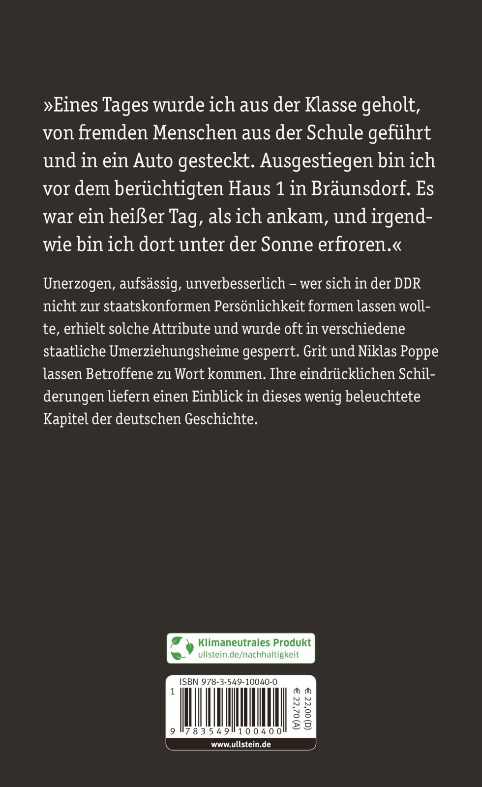 | Schlagworte | Arrest • DDR • DDR-Opposition • Isolation • Jugendliche • Jugendwerkhof • Kinder • Kinderheim • Kommunismus • Missbrauch • Ostdeutschland • Pioniere • renitent • Schule • Schwarze Pädagogik • SED • Sozialismus • Stasi • Torgau • Trauma • Ulrike Poppe • Umerziehung • Unrecht • weggesperrt • Wehrkunde |
