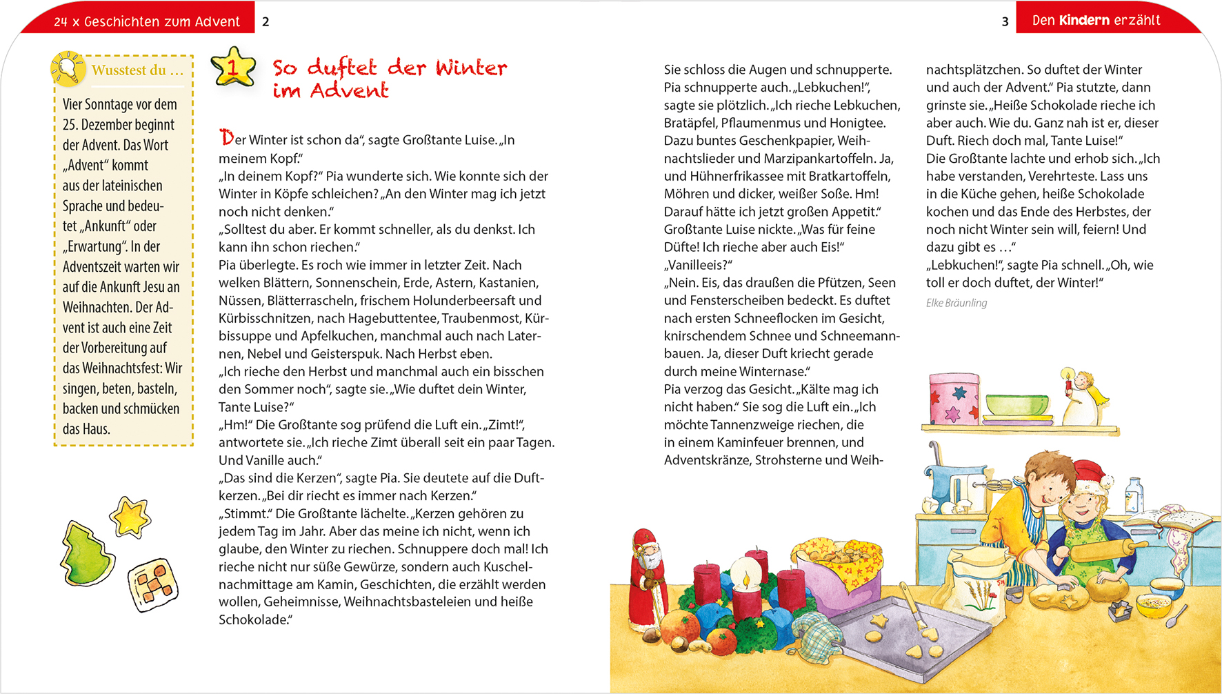 Vorlesegeschichten zum AdventWas findet Lina in einem geheimnisvollen Pappkarton?Wer entdeckt mitten im Wald einen Weihnachtsschatz?Warum sorgt Sebastian für Wirbelbeim Krippenspiel? Und was hat die kleine Mausvom Nikolaus zu erzählen? Diese und andere Geschichtenladen zum Vorlesen ein und begleitenKinder durch die Adventszeit. Außerdem werdendie christlichen Bräuche rund um Weihnachtenkindgerecht erklärt. So macht das Warten auf denHeiligen Abend Spaß!- Ein Adventskalender zum Vorlesen- Mit Geschichten von Martin Thull, Elke Bräunling, Rolf Krenzer, Regina Meier zu Verl u.a.- Mit wissenswerten Infos zu christlichen Bräuchen rund um Advent und Weihnachten- Die kurzen Geschichten eignen sich auch für den Morgenkreis - Für Kinder im Vor- und Grundschulalter