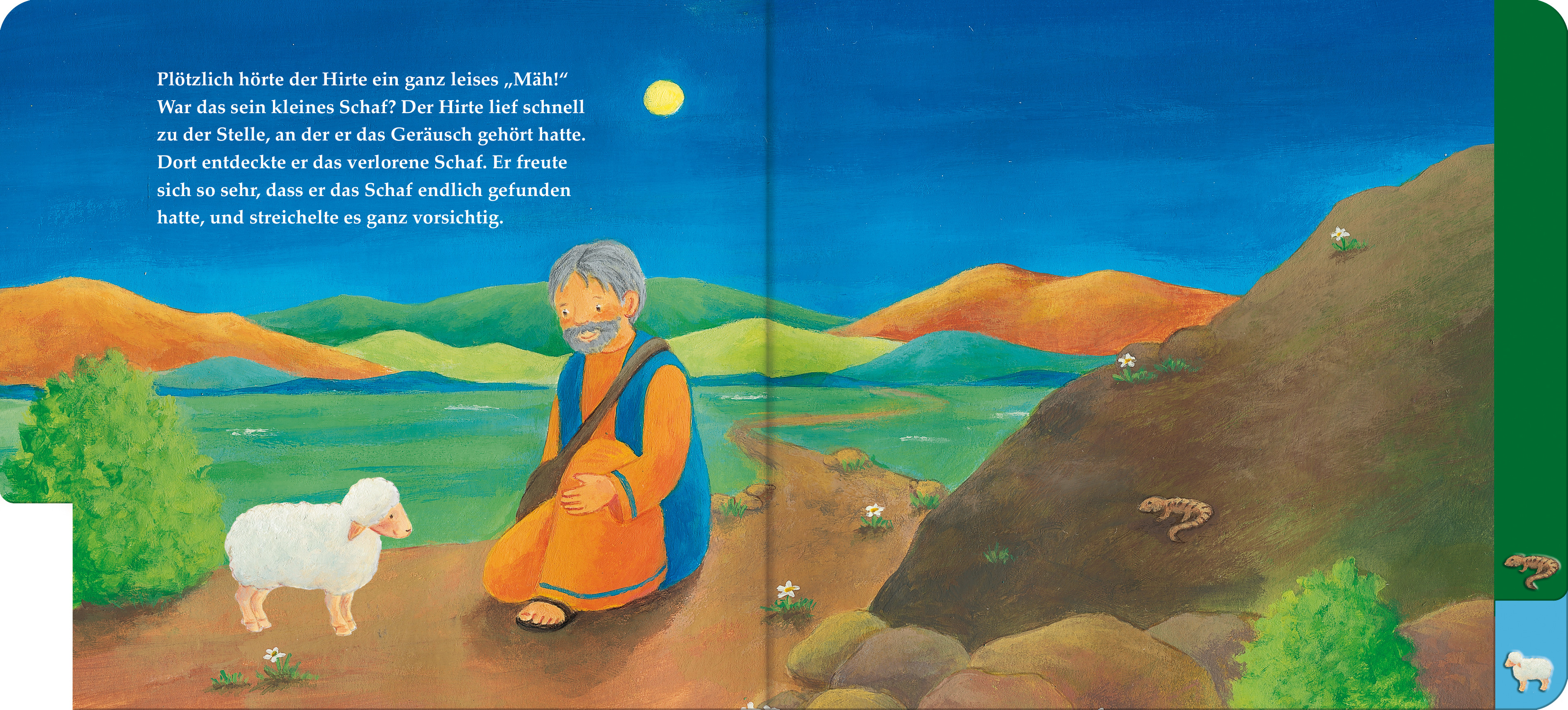 | Schlagworte | Bilderbuch • Bilderbuch Neues Testament • Bilderbuch Schaf • Gleichnis vom verlorenen Schaf • Griffregister • Hirte • Jesus • Kinderbuch Jesus • Nacherzählung • verlorene Schaf • Vermittlung von Werten |