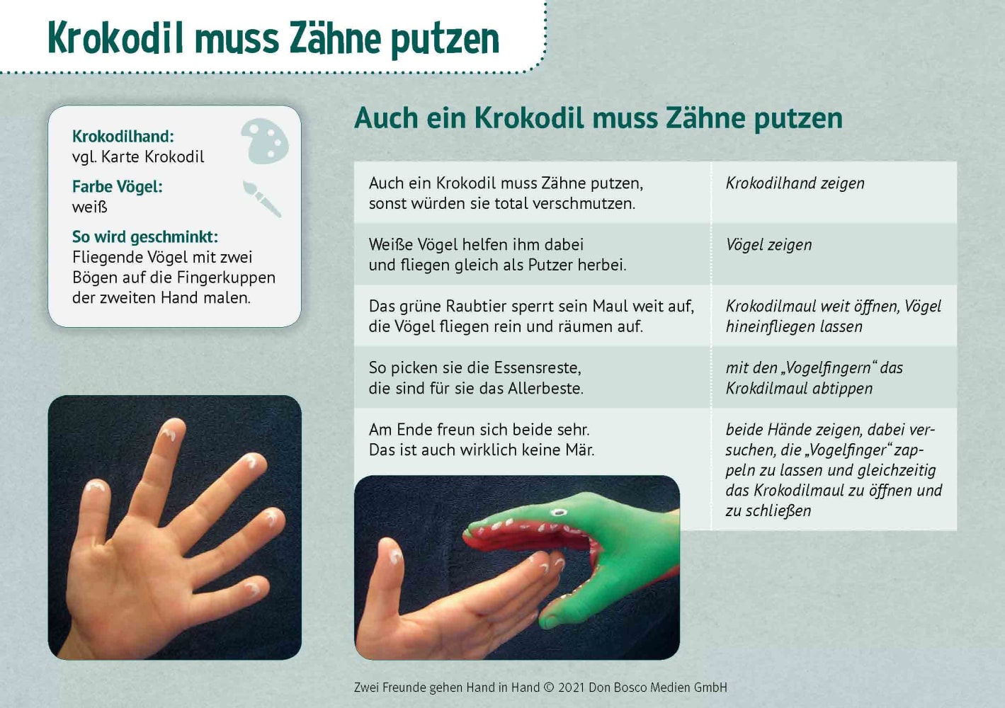 Jede der 30 Spielideen besteht aus Schminktipps, der kurzen Geschichte in Versform und Ideen zur musikalischen Untermalung mit Orff-Instrumenten. Dabei sind der kindlichen Fantasie keine Grenzen gesetzt - die Geschichten dürfen nach dem Vortrag beliebig weitererzählt oder auch komplett neu erfunden werden! Beim Nachahmen der Bewegungen von Fisch, Schnecke und Co. wird ganz von selbst die Motorik gefördert. Die immer neuen Abenteuer der tierischen Protagonisten regen die Kreativität an und unterstützen die Sprachförderung.Mit farbigen Fingern Theater spielen - mit dem Kartenset von Don Bosco gelingt das im Handumdrehen!