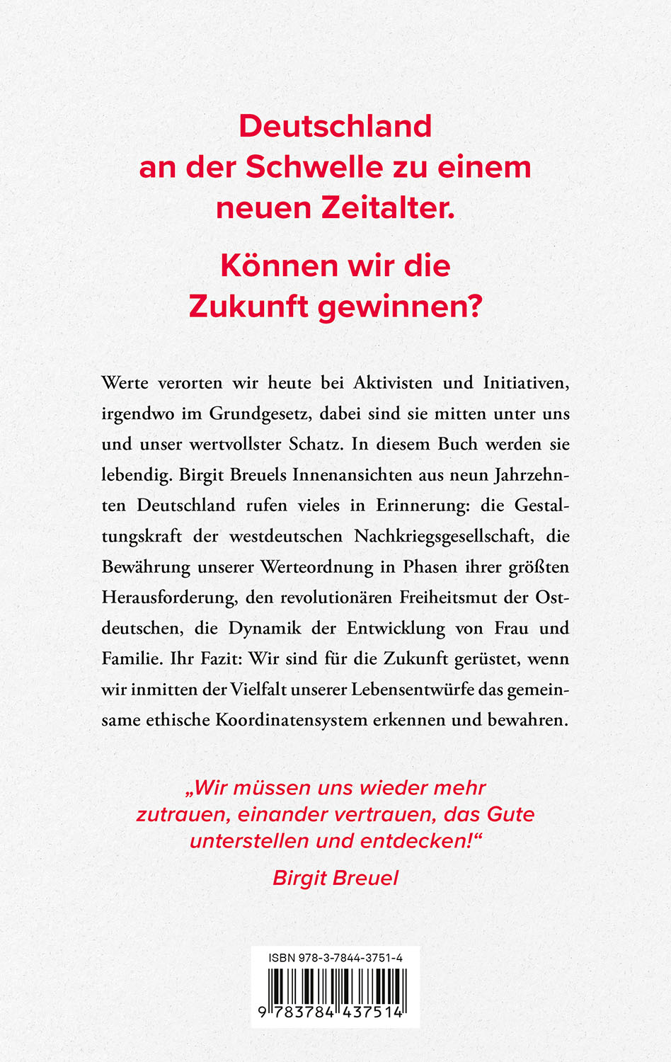 Deutschland an der Schwelle zu einem neuen Zeitalter. Können die Deutschen Wandel? Disruptive Transformation? Können wir optimistisch sein, die Zukunft zu gewinnen – whatever it takes? Die Antwort findet Birgit Breuel in neun Jahrzehnten erlebtem Deutschland. Ihre persönliche Reise durch Wirtschaftswunder, Wertewandel und Zeitenwenden zeigt ein von Umbrüchen geprägtes Deutschland und überrascht mit einer öffentlich unbekannten Birgit Breuel. Die Innenansichten der ehemaligen Treuhandchefin aus schwierigen und glücklichen Zeiten unseres Landes machen Werte und Stärken unserer Gemeinschaft sichtbar, derer wir uns neu vergewissern müssen. Birgit Breuel ist überzeugt: „Wandel braucht Vertrauen auf gemeinsame Stärken.“