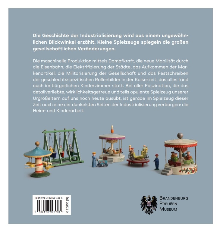 Die Geschichte der Industrialisierung wird aus einem ungewöhnlichen Blickwinkel erzählt. Kleine Spielzeuge spiegeln die großen gesellschaftlichen Veränderungen.Die maschinelle Produktion mittels Dampfkraft, die neue Mobilität durch die Eisenbahn, die Elektrifizierung der Städte, das Aufkommen der Markenartikel, die Militarisierung der Gesellschaft und das Festschreiben der geschlechtsspezifischen Rollenbilder in der Kaiserzeit, das alles fand auch im bürgerlichen Kinderzimmer statt. Bei aller Faszination, die das detailverliebte, wirklichkeitsgetreue und teils opulente Spielzeug unserer Urgroßeltern auf uns noch heute ausübt, ist gerade im Spielzeug dieser Zeit auch eine der dunkelsten Seiten der Industrialisierung verborgen: die Heim- und Kinderarbeit.