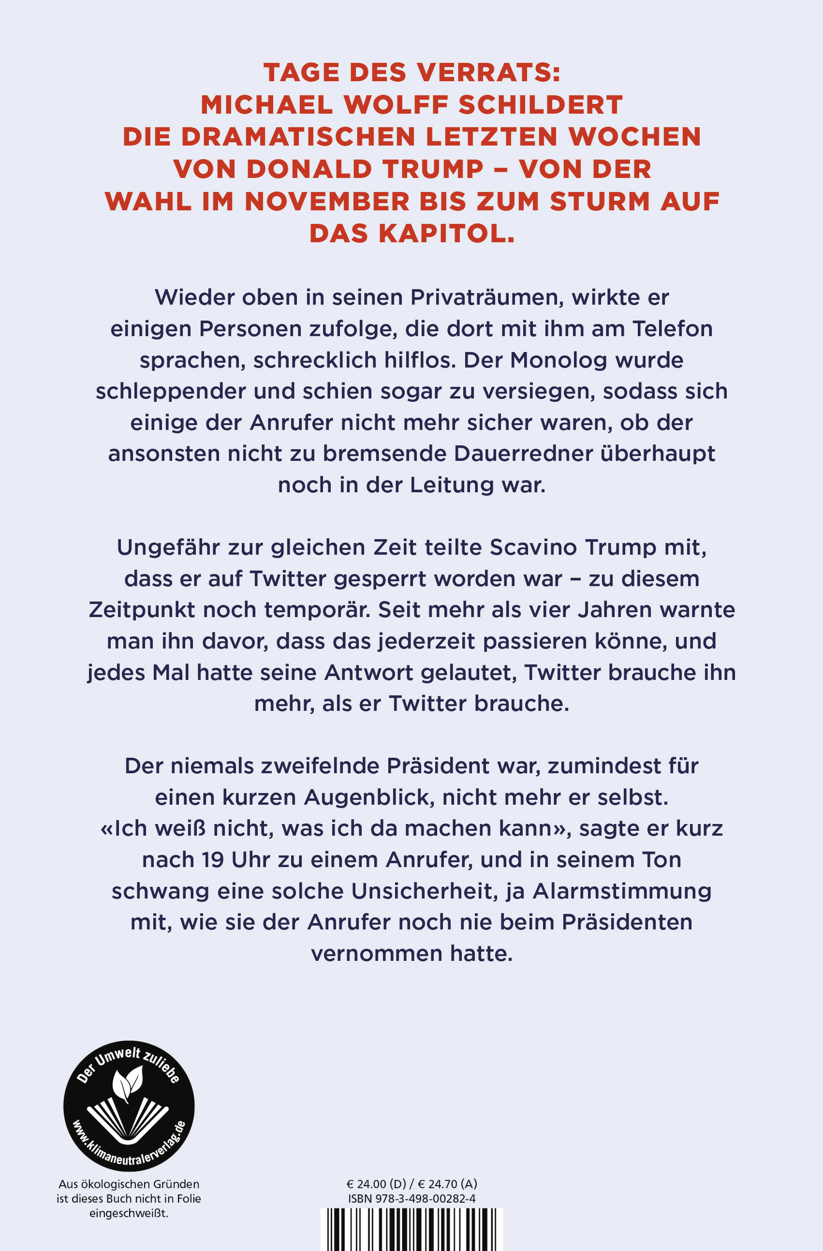 Michael Wolff beschrieb in seinem Bestseller «Feuer und Zorn» die ersten fiebrigen Monate der Trump-Regierung. Nun haben sich ihm wieder hochrangige Mitarbeiter des Weißen Hauses anvertraut: Wolff liefert eine aktuelle Darstellung der letzten Wochen von Trumps Präsidentschaft und der Versuche des Präsidenten und seines Umfelds, das Wahlergebnis vom November 2020 auf jedem nur denkbaren Weg zu korrigieren. Er schreibt über den Wahn eines Verlierers, den Kampf der Anwälte um Rudy Giuliani, den Angriff aufs Kapitol und über das endgültige Ende einer denkwürdigen und gefährlichen Regierungszeit - und interviewt schließlich Trump selbst in Mar-a-Lago.