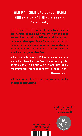 »Man lese in diesem kleinen Buch die jüngsten Reden von Alexei Nawalny vor Gericht. Es sind Plädoyers für die Freiheit. Plädoyers dafür, nicht zu schweigen, wenn so eklatantes Unrecht geschieht. Die Gerichtsreden Nawalnys sind eindrucksvolle Freiheitsdokumente - auch für nachgeborene Generationen.« Aus dem Vorwort von Gerhart Baum