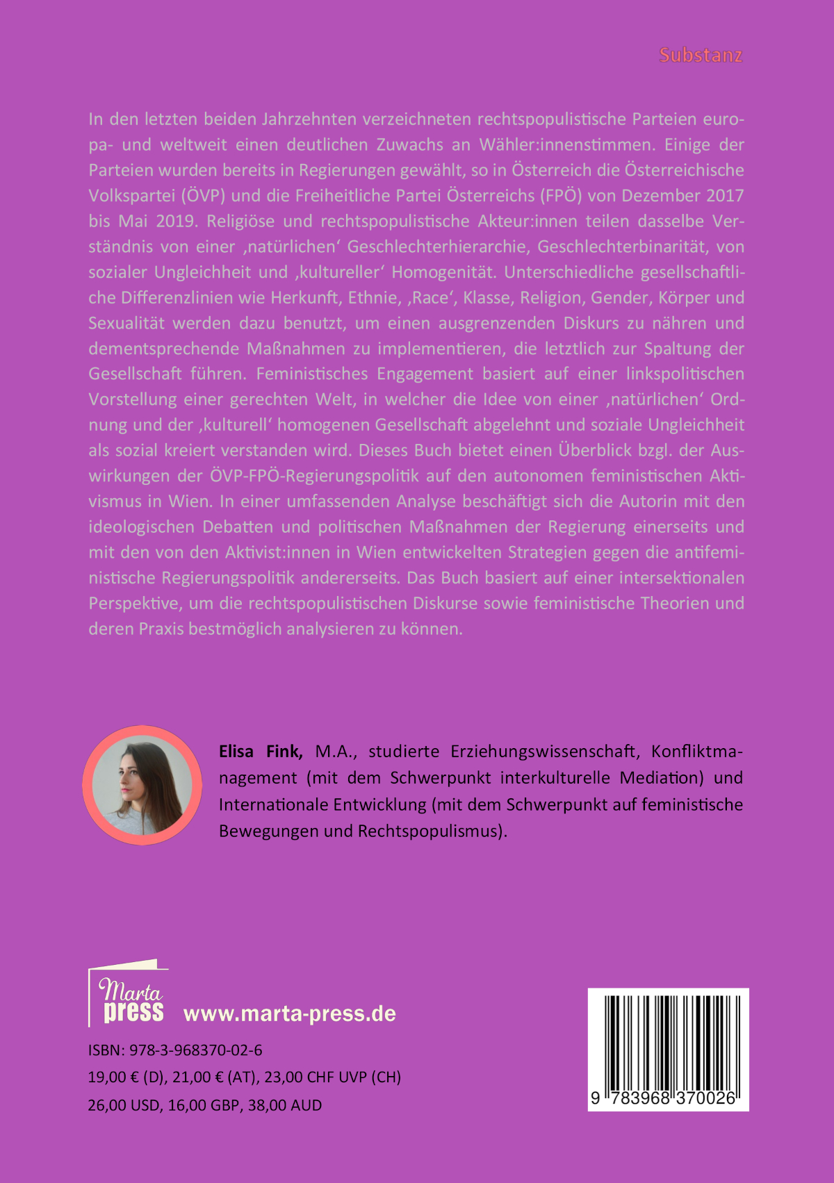 Elisa Fink, M.A., studierte Erziehungswissenschaft, Konfliktmanagement mit dem Schwerpunkt interkulturelle Mediation und Internationale Entwicklung mit den Schwerpunkten auf feministische Bewegungen und Rechtspopulismus.