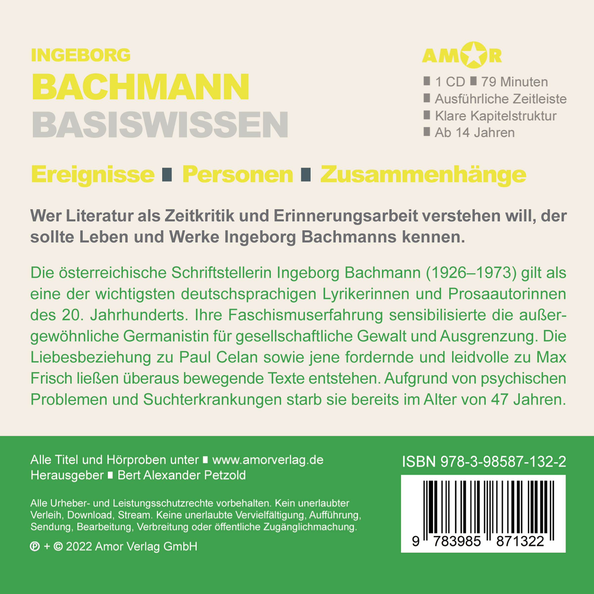Wer Literatur als Zeitkritik und Erinnerungsarbeit verstehen will, der sollte Leben und Werke Ingeborg Bachmanns kennen. Der erfahrene Autor und Herausgeber Bert Alexander Petzold nimmt uns mit auf eine faktenreiche Kulturreise und erläutert verständlich, unterhaltsam und strukturiert Basiswissen zu Ingeborg Bachmann.
