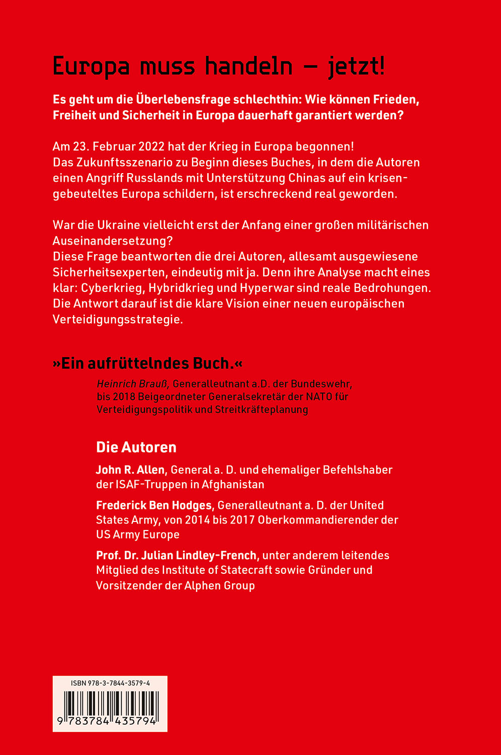 Wie kann der Frieden in Europa dauerhaft gesichert werden? Die vorliegende Analyse dreier herausragender Sicherheitsexperten beschreibt die enormen politisch-militärischen Herausforderungen und entwirft die radikale Vision einer europäischen Verteidigungsstrategie. Klar ist: Cyber-Krieg, Hybrid-Krieg und "Hyperwar" sind reale Bedrohungen - und für die Europäer ist es höchste Zeit, sehr viel mehr für die eigene Verteidigung tun.