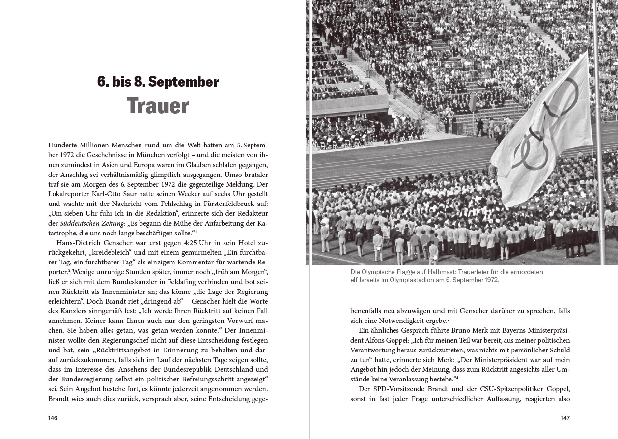 04:20 bis 5:22 Uhr: Überfall 7VORSPIEL1965 bis 1970: Hoffnung 151970 bis 1972: Sicherheit 2326. August bis 4. September: Freude 34DRAMA05:25 bis 08:15 Uhr: Forderung 4508:35 bis 11:15 Uhr: Verhandlung 5811:20 bis 17:21 Uhr: Zeitgewinn 7417:23 bis 21:35 Uhr: Täuschung 10521:36 bis 22:34 Uhr: Falle 11722:35 bis 01:32 Uhr: Katastrophe 12301:45 bis 03:45 Uhr: Schock 136NACHSPIEL6. bis 18. September: Trauer 1461972 bis 1981: Vergeltung 1591972 bis 2022: Gedenken 170Bilanz 179ANHANGZu diesem Buch 184Dank 192Pläne 194Personenübersicht 196Abbildungsverzeichnis 201Abkürzungsverzeichnis 202Anmerkungen 204Quellen- und Literaturverzeichnis 234