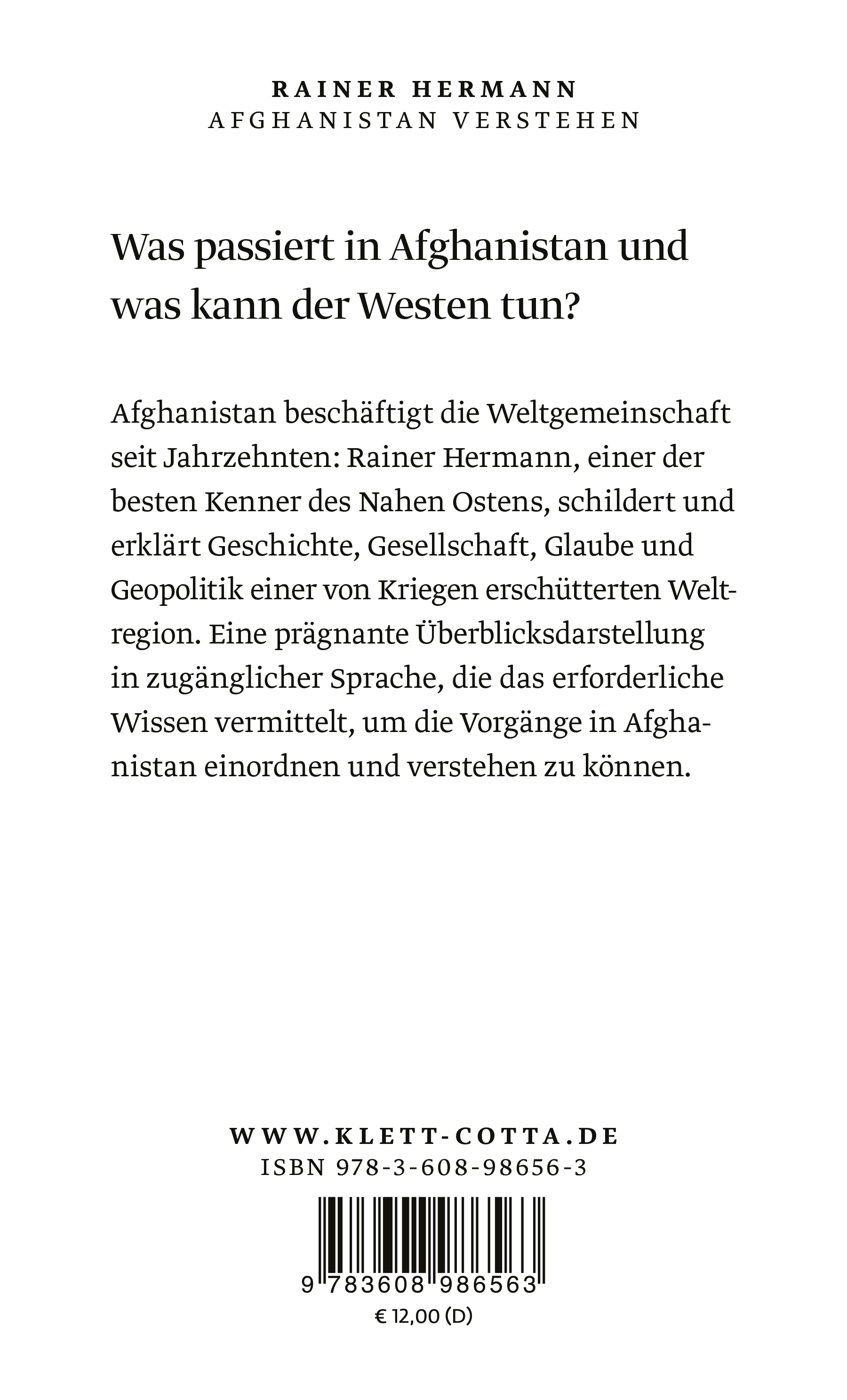 Afghanistan beschäftigt die Weltgemeinschaft seit Jahrzehnten: Rainer Hermann, einer der besten Kenner des Nahen Ostens, schildert und erklärt Geschichte, Gesellschaft, Glaube und Geopolitik einer von Kriegen erschütterten Weltregion. Eine prägnante Überblicksdarstellung in zugänglicher Sprache, die das erforderliche Wissen vermittelt, um die Vorgänge in Afghanistan einordnen und verstehen zu können.