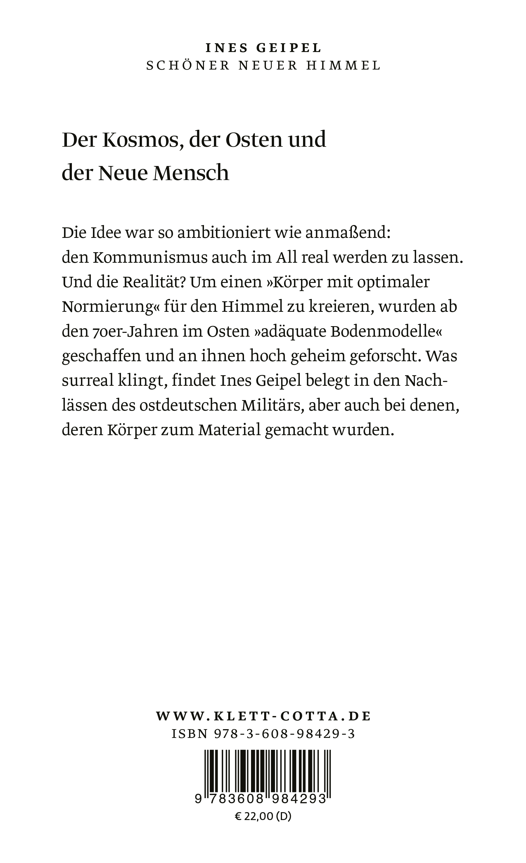 Der Neue Mensch im All galt im Weltraumprogramm der Sowjetunion als absoluter Leitstern und löste in der DDR zwischen 1972 und 1989 eine gründliche Forschungstätigkeit aus. Die Unterwerfung und Beherrschung des Kosmos sollte durch Hochleistungsflieger, die sich über Jahre im All aufhalten konnten, möglich werden. Wie erschafft man diesen maximal normierten und bedürfnislosen Körper? Aus den Verschlussakten der DDR-Militärforschung, heute zugänglich im Militärarchiv Freiburg, setzt Ines Geipel ein verstörendes Bild zusammen: Experimentiert wurde nicht nur an Tieren, sondern auch an Menschen, in Krankenhäusern, Gefängnissen, an Soldaten und im Hochleistungssport. Das Streben nach der Vorherrschaft im Kosmos ist nicht Vergangenheit, sondern erfährt heute eine Renaissance.