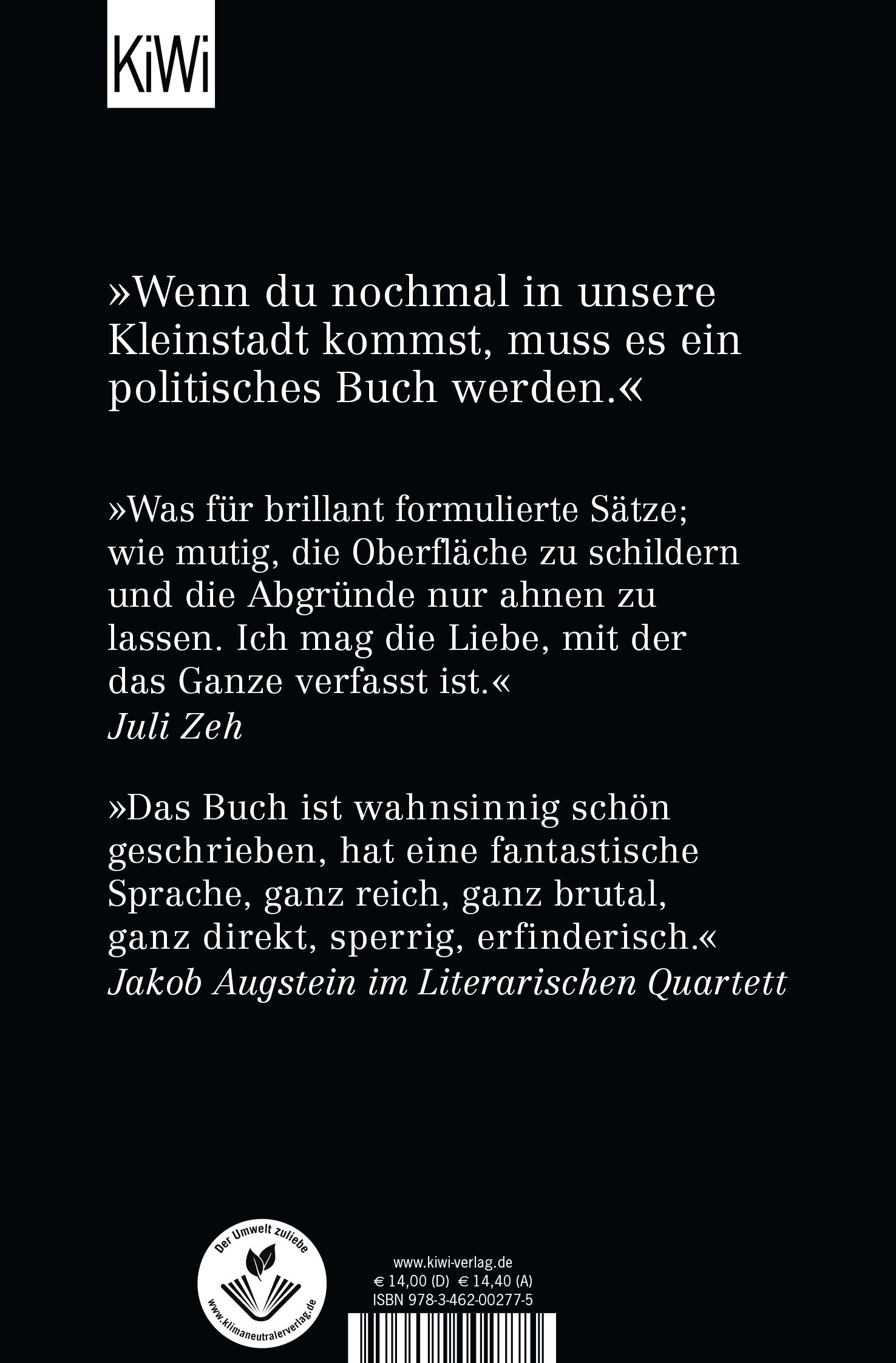 Er sitzt in illegalen Kneipen, in Wohnzimmern und in Getränkemärkten. Er notiert mit oder lässt das Aufnahmegerät laufen. Das Urgestein Blocky, der Kneipenmann Heiko Schröder und die tätowierten Punks Raul und Eric tauchen wieder auf, neues Personal tritt nach vorne: die Bäckersfrau Katharina, das Barmädchen Pretty Baby, ein linker Skinhead, der in den 1990er-Jahren vor den rechten Glatzen fliehen musste. Anders als vor zehn Jahren ist der Reporter in der Kleinstadt aber kein Fremder mehr, und sehr schnell wird klar: Das ist hier nicht mehr das Deutschland, das es vor zehn Jahren war. »Wenn du noch mal in unsere Stadt kommst, dann musst du ein politisches Buch schreiben«, hatte Raul, einer der Protagonisten, dem Reporter erklärt.
