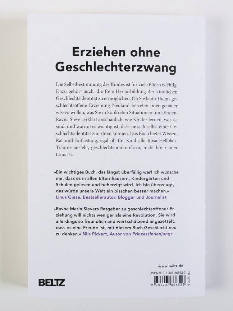 »Ein Ratgeber, der gefehlt hat: lesenswert und voller Denkanstöße.« Sylvia Meise, Psychologie Heute, 8/2022 »Das Buch bietet Eltern Entlastung, egal ob ihr Kind geschlechts(non)konform, nicht binär oder trans ist.« Dr. med. Mabuse, Heft 258 - 4. Quartal 2022 »Wer geschlechtsoffene Erziehung praktizieren möchte, kann sich mit diesem Buch in der Hand den Herausforderungen des Alltags gewappnet sehen.« Susanne Mierau, @geborgen_wachsen_buchtipps, 22.02.2023 »Ein wichtiges Buch, das längst überfällig war! Ich wünsche mir, dass es in allen Elternhäusern, Kindergärten und Schulen gelesen und beherzigt wird. Ich bin überzeugt, das würde unsere Welt ein bisschen besser machen.« Linus Giese, Bestsellerautor, Blogger und Journalist »Ravna Marin Sievers Ratgeber zu geschlechtsoffener Erziehung will nichts weniger als eine Revolution. Sie wird allerdings so freundlich und wertschätzend angezettelt, dass es eine Freude ist, mit diesem Buch Geschlecht neu zu denken.« Nils Pickert, Autor von Prinzessinnenjungs »So hätte ich mir meine Kindheit gewünscht: geschlechtsoffen, bunt und voller Möglichkeiten. Ein erhellendes Buch mit vielen Fallbeispielen und praktischen Tipps. Ein Muss für Eltern, Fachkräfte und alle, denen das Kindeswohl am Herzen liegt.« Jayrôme C. Robinet, Schriftsteller