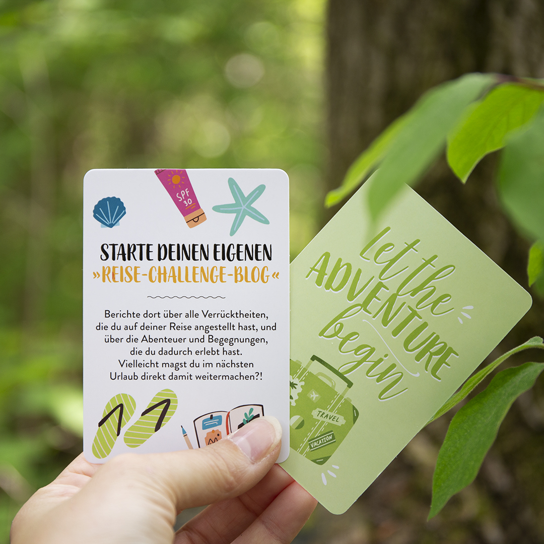 Wer will nicht solche abenteuerlichen Geschichten aus dem Urlaub zum Besten geben? Mit den Challenges auf diesen Karten könntest du schon beim nächsten Urlaub eine solche Geschichte erleben. Im wunderbar handlichen Spielkartenformat passen 50 Kärtchen in jedes Handgepäck oder jeden Backpack hinein und sind so ein prima Reisebegleiter. Man kann sie überall anwenden, ob als willkommene Abwechslung oder lustiger Zeitvertreib im Strandurlaub oder als hilfreiches Werkzeug, um in eine fremde Kultur einzutauchen - die Herausforderungen sorgen für ungewöhnliche Erlebnisse, spannende Begegnungen und überraschende Gespräche. Für Reisefans und Urlaubshungrige sind sie damit ein perfektes Geschenk zum Abschied ins Abenteuer!