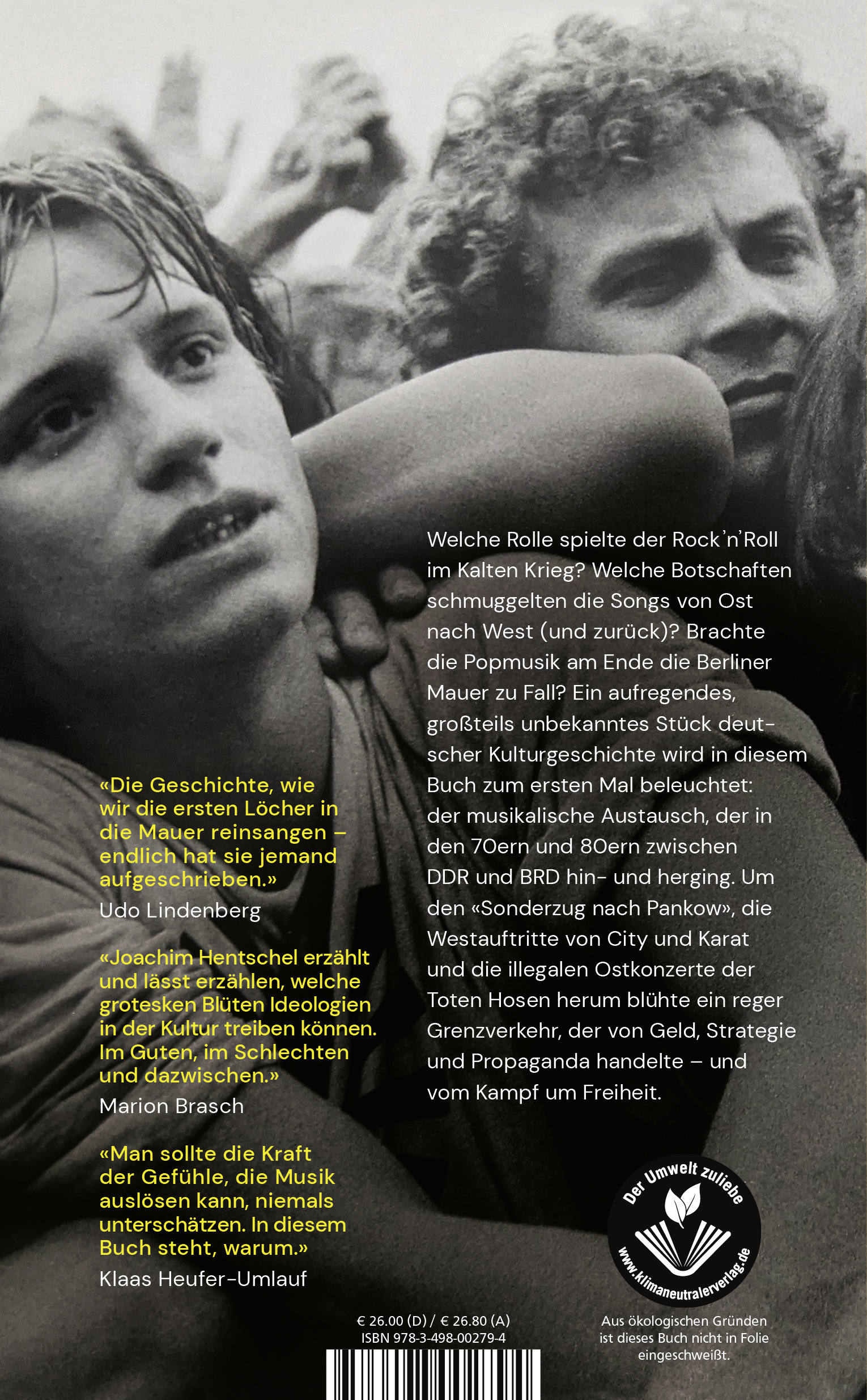 Welche Rolle spielte der Rock’n’Roll im Kalten Krieg? Welche Botschaften schmuggelten die Songs von Ost nach West (und zurück)? Brachte die Popmusik am Ende die Berliner Mauer zu Fall? Ein aufregendes, großteils unbekanntes Stück deutscher Kulturgeschichte wird in diesem Buch zum ersten Mal beleuchtet: der musikalische Austausch, der in den 70ern und 80ern zwischen DDR und BRD hin- und herging. Um den „Sonderzug nach Pankow“, die Westauftritte von City und Karat und die illegalen Ostkonzerte der Toten Hosen herum blühte ein reger Grenzverkehr, der von Geld, Strategie und Propaganda handelte – und vom Kampf um Freiheit.