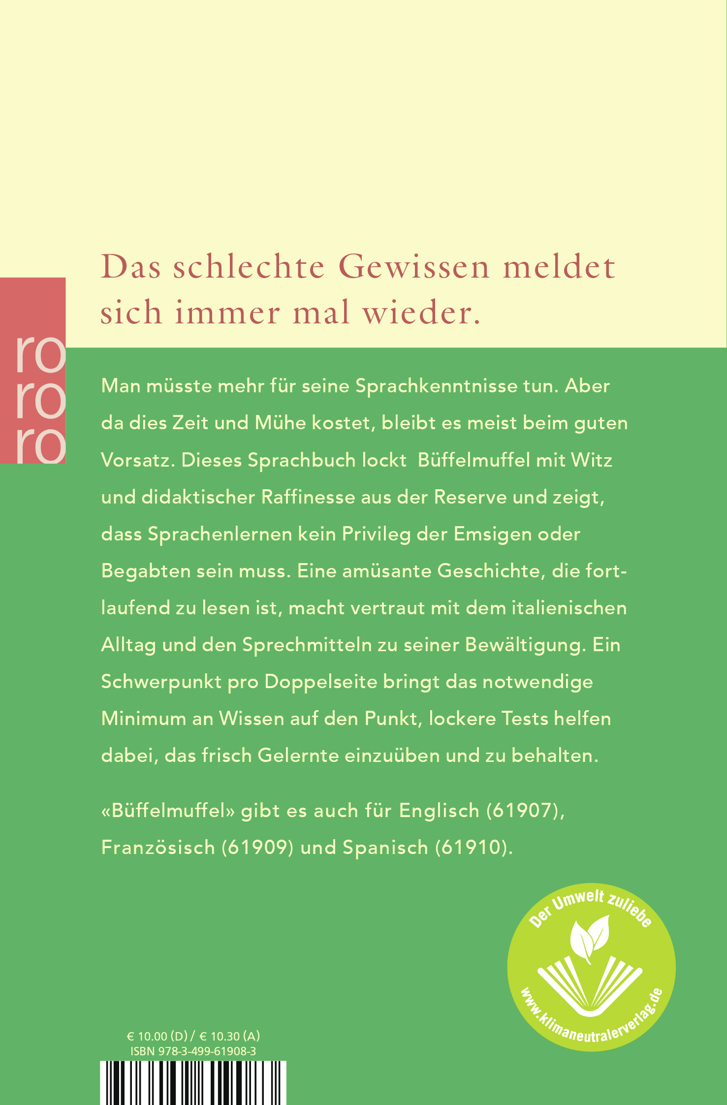Man müsste mehr für seine Sprachkenntnisse tun. Aber da dies Zeit und Mühe kostet, bleibt es meist beim guten Vorsatz. Dieses Sprachbuch lockt Büffelmuffel mit Witz und didaktischer Raffinesse aus der Reserve und zeigt, dass Sprachenlernen kein Privileg der Emsigen oder Begabten sein muss. Eine amüsante Geschichte, die fortlaufend zu lesen ist, macht vertraut mit dem italienischen Alltag und den Sprechmitteln zu seiner Bewältigung. Ein Schwerpunkt pro Doppelseite bringt das notwendige Minimum an Wissen auf den Punkt, lockere Tests helfen dabei, das frisch Gelernte auszuüben und zu behalten.
