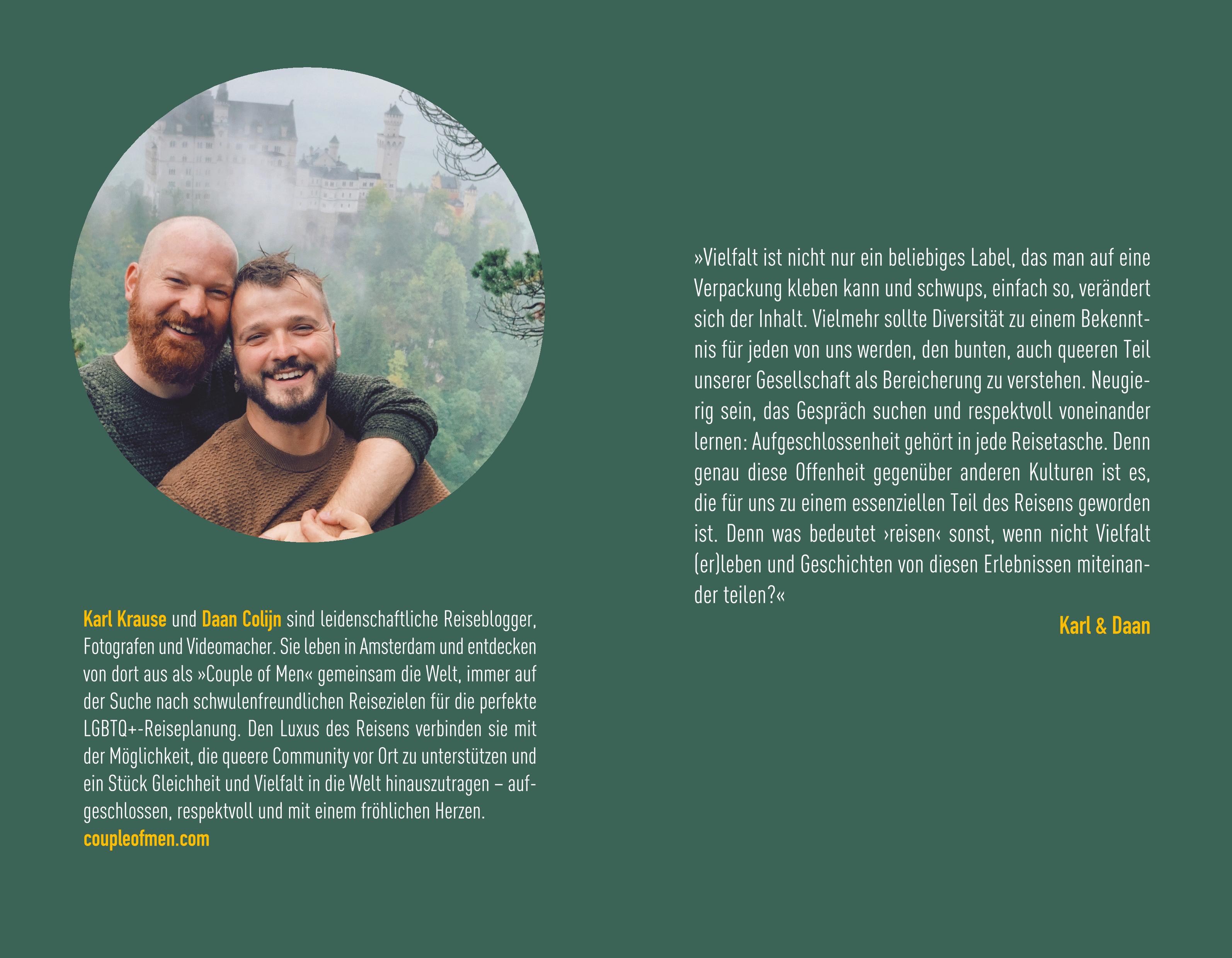 Karl Krause und Daan Colijn, leidenschaftliche Reiseblogger, Fotografen und Videomacher, leben in Amsterdam und haben gemeinsam bereits mehr als 50 Länder auf fünf Kontinenten entdeckt. Den Luxus des Reisens möchten sie auch mit der Möglichkeit verbinden, ein Stück Gleichheit und Vielfalt in die Welt hinauszutragen.