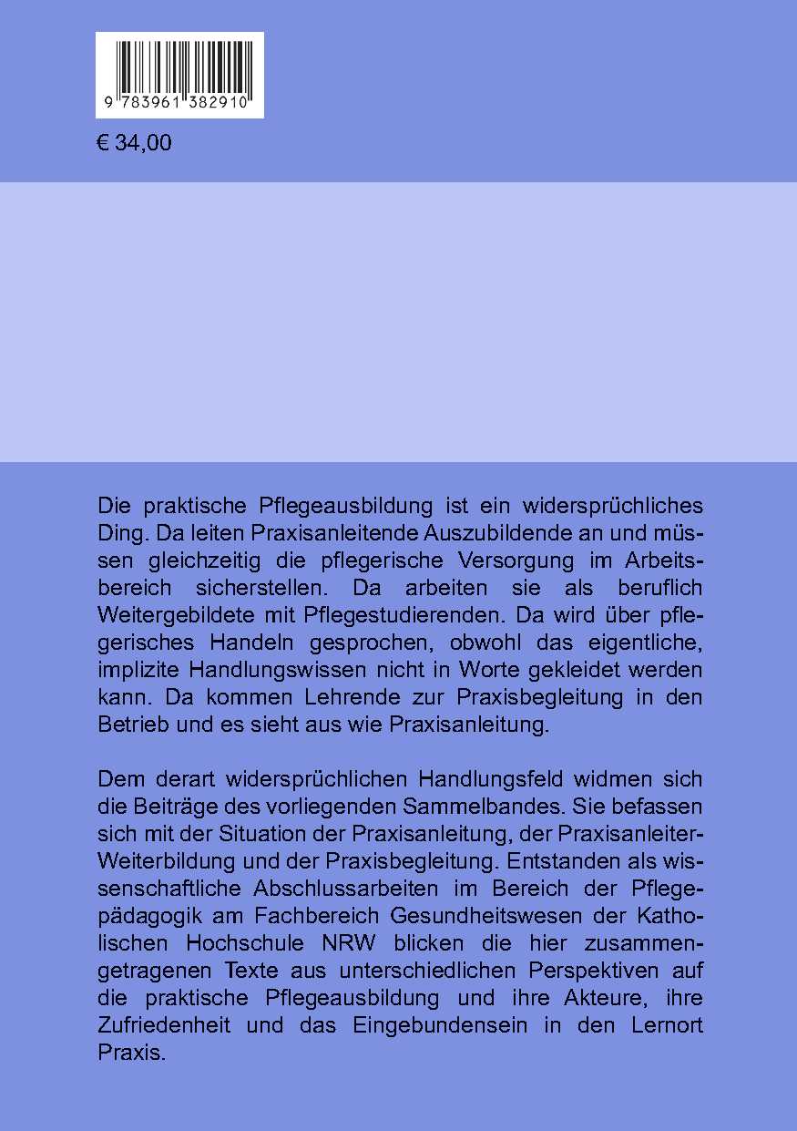 Dem derart widersprüchlichen Handlungsfeld widmen sich die Beiträge des vorliegenden Sammelbandes. Sie befassen sich mit der Situation der Praxisanleitung, der Praxisanleiter-Weiterbildung und der Praxisbegleitung. Entstanden als wissenschaftliche Abschlussarbeiten im Bereich der Pflegepädagogik am Fachbereich Gesundheitswesen der Katholischen Hochschule NRW blicken die hier zusammengetragenen Texte aus unterschiedlichen Perspektiven auf die praktische Pflegeausbildung und ihre Akteure, ihre Zufriedenheit und das Eingebundensein in den Lernort Praxis.
