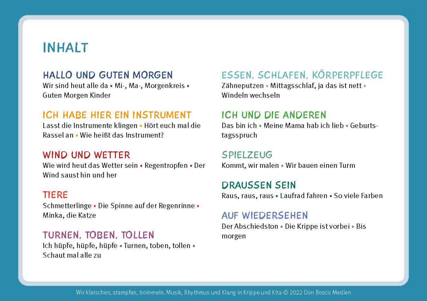 Ob Zahnputz-Lied, Farben-Reim oder das Nachmachen von Geräuschen - mit diesen musikalischen Ideen können Kinder kleine Geschichten und Verse lebendig werden lassen. Neben Körperinstrumenten kommen dabei Orff-Instrumente wie Handtrommel, Glöckchen, Rassel und Klanghölzer zum Einsatz. Einfache Worte und viele Wiederholungen sorgen dafür, dass die Kinder die Verse schnell verinnerlichen und mitsprechen können.
