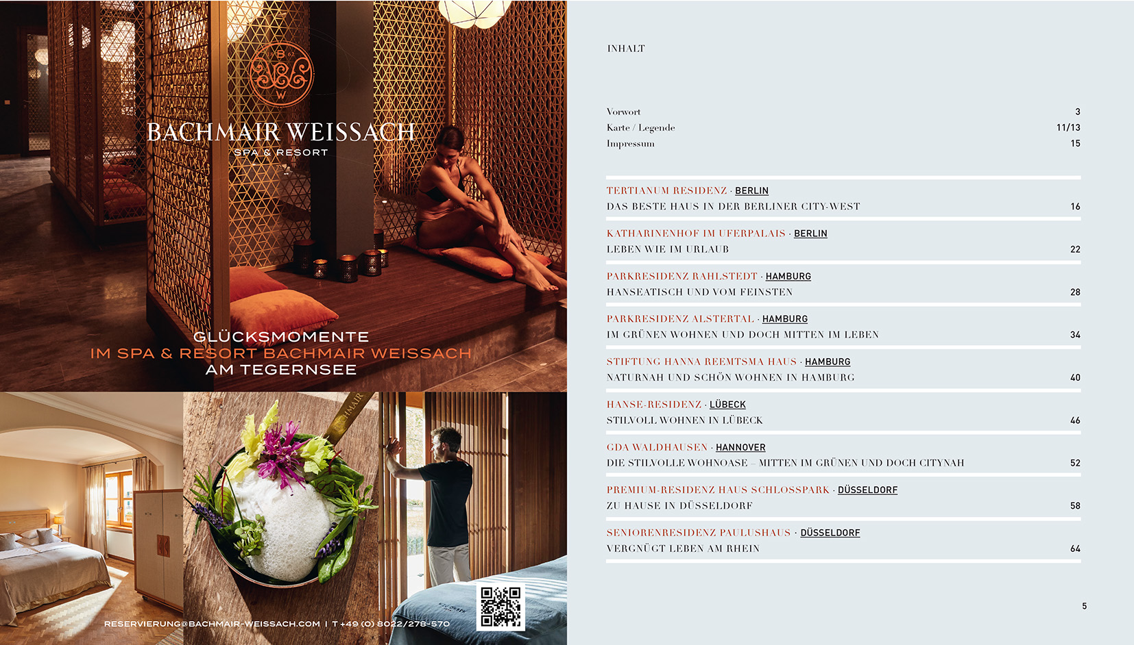 Liebe Leserinnen und Leser,Probieren geht über Studieren! Diese Weisheit ist ja nicht wirklich neu. Aber wenn es an der Zeit ist, sich noch einmal für ein neues Zuhause und eine neue Umgebung zu entscheiden, sind Erkenntnisse aus direkter Anschauung besonders nützlich und wertvoll. Wenn Sie über Ihre Ansprüche an ein komfortables und rundum bestens versorgtes Leben im verdienten Ruhestand nachdenken, können wir Ihre Entscheidung etwas leichter machen. Im jährlich erscheinenden Ratgeber "Premium Residenzen" finden Sie über 25 Residenzen in Deutschland, Österreich, Schweiz und Spanien jeweils sechs seitig beschrieben und bebildert, um sich mit dem Thema vertraut zu machen. Potenzielle Interessenten setzen sich mit diesem Thema immer früher auseinander, oft schon in den ersten Jahren des Ruhestands. Was sehr viel Sinn ergibt, denn eine frühe Anmeldung ist angesichts längerer Wartezeiten absolut ratsam.