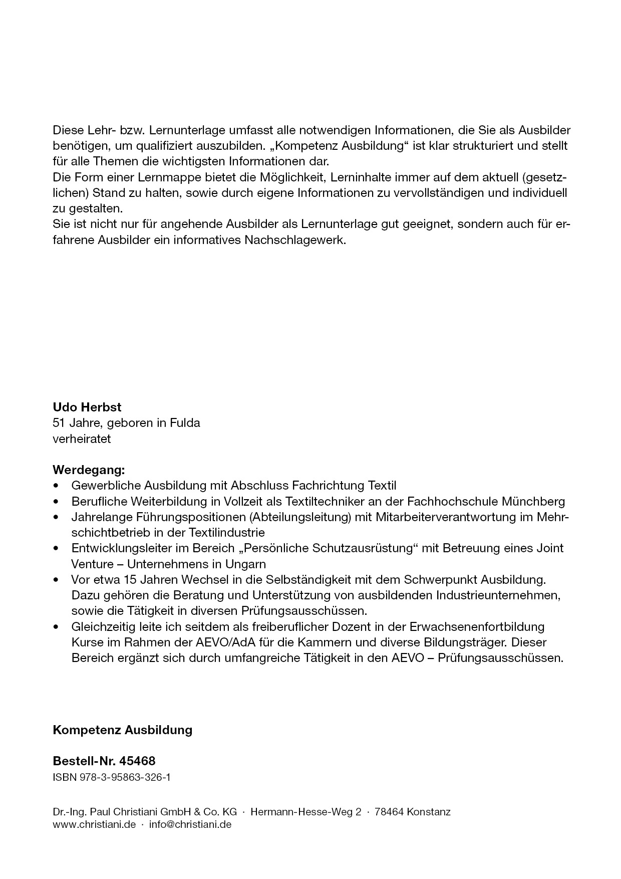 Diese Lehr- bzw. Lernunterlage umfasst alle notwendigen Informationen, die Sie als Ausbilder benötigen, um qualifiziert auszubilden. "Kompetenz Ausbildung" ist klar strukturiert und stellt für alle Themen die wichtigsten Informationen dar.Die Form einer Lernmappe bietet die Möglichkeit, Lerninhalte immer auf dem aktuell (gesetzlichen) Stand zu halten, sowie durch eigene Informationen zu vervollständigen und individuell zu gestalten.Sie ist nicht nur für angehende Ausbilder als Lernunterlage gut geeignet, sondern auch für erfahrene Ausbilder ein informatives Nachschlagewerk.