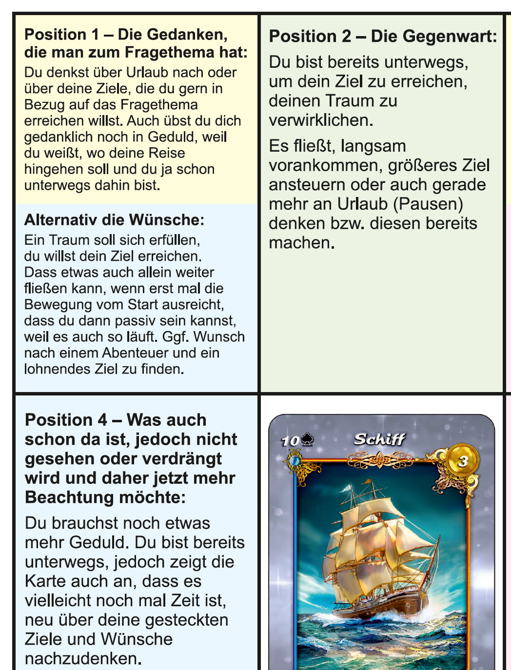 Der Rest kommt im Laufe der Zeit von alleine. Je öfter du mit den Karten deutest und in den Übersichten nach den Deutungen (Stichworte, Anregungen und Hilfen) schaust, umso mehr verinnerlicht sich das Ganze.