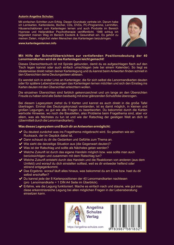Du kannst jede der 8 Kartenpositionen der 40 Lenormandkarten nachlesen (pro Lenormandkarte = 1 DIN A4 Seite im Überblick).