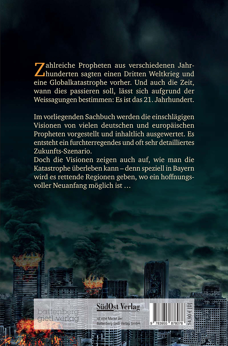 Zahlreiche Propheten aus verschiedenen Jahrhunderten sagten einen Dritten Weltkrieg und eine Globalkatastrophe vorher. Und auch die Zeit, wann dies passieren soll, lässt sich aufgrund der Weissagungen bestimmen: Es ist das 21. Jahrhundert.Im vorliegenden Sachbuch werden die einschlägigen Visionen von vielen deutschen und europäischen Propheten vorgestellt und inhaltlich ausgewertet. Es entsteht ein furchterregendes und oft sehr detailliertes Zukunfts-Szenario.Doch die Visionen zeigen auch auf, wie man die Katastrophe überleben kann - denn speziell in Bayern wird es rettende Regionen geben.Folgende Propheten werden mit ihren Weissagungen vorgestellt:-Andreas Stormberger-Mühlhiasl-Sepp Wudy-Alois Irlmaier-Waldhirte Prokop-Josef Kronschnabl-Berta Hacker-Bauer aus Selb-Zellertaler Bauer-Bartholomäus Holzhauser-Bauer aus dem Waldviertel-Blinder Hirte von Prag-Sibylle von Prag-Mönch von Wismar-Eismeerfischer Johansson-Johannes von Jerusalem-Merlin