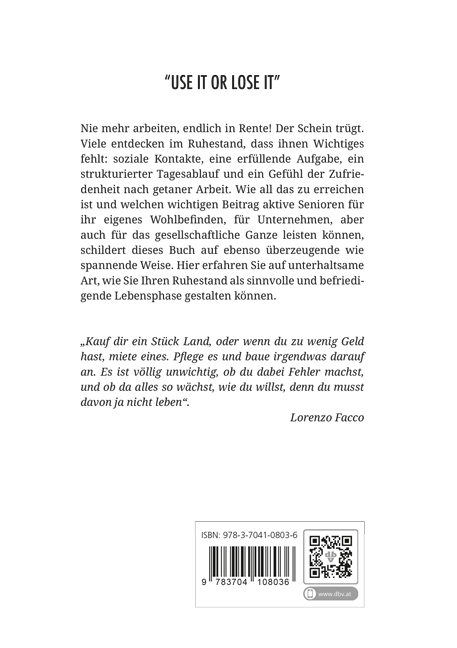 Nie mehr arbeiten, endlich in Rente! Der Schein trügt. Viele entdecken im Ruhestand, dass ihnen Wichtiges fehlt: soziale Kontakte, eine erfüllende Aufgabe, ein strukturierter Tagesablauf und ein Gefühl der Zufriedenheit nach getaner Arbeit. Wie all das zu erreichen ist und welchen wichtigen Beitrag aktive Senioren für ihr eigenes Wohlbefinden, für Unternehmen, aber auch für das gesellschaftliche Ganze leisten können, schildert dieses Buch auf ebenso überzeugende wie spannende Weise. Hier erfahren Sie auf unterhaltsame Art, wie Sie Ihren Ruhestand als sinnvolle und befriedigende Lebensphase gestalten können.