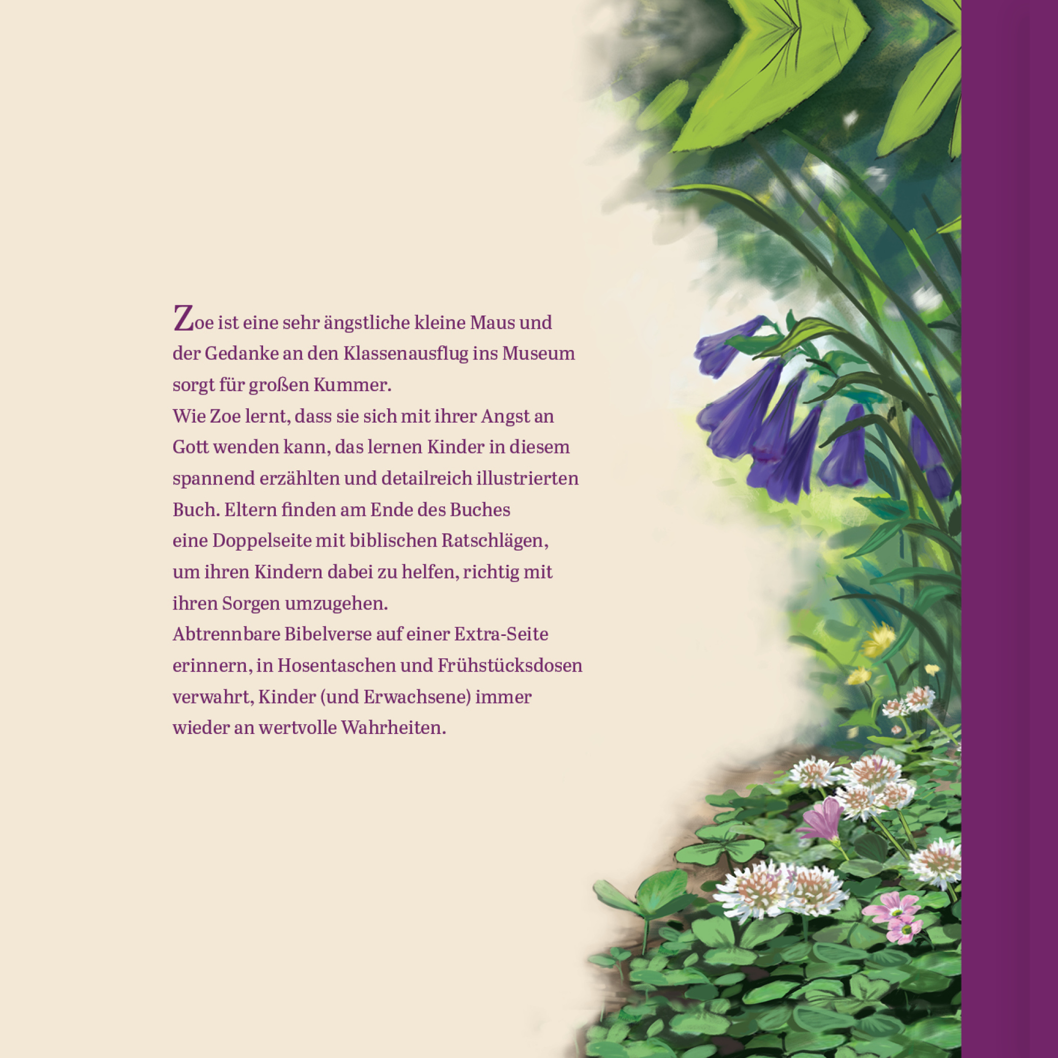 Zoe ist eine sehr ängstliche kleine Maus. Mithilfe ihrer Mama lernt sie bei einem Klassenausflug, dass sie sich mit ihrer Furcht an Gott wenden kann, der immer bei ihr ist und ihr hilft.