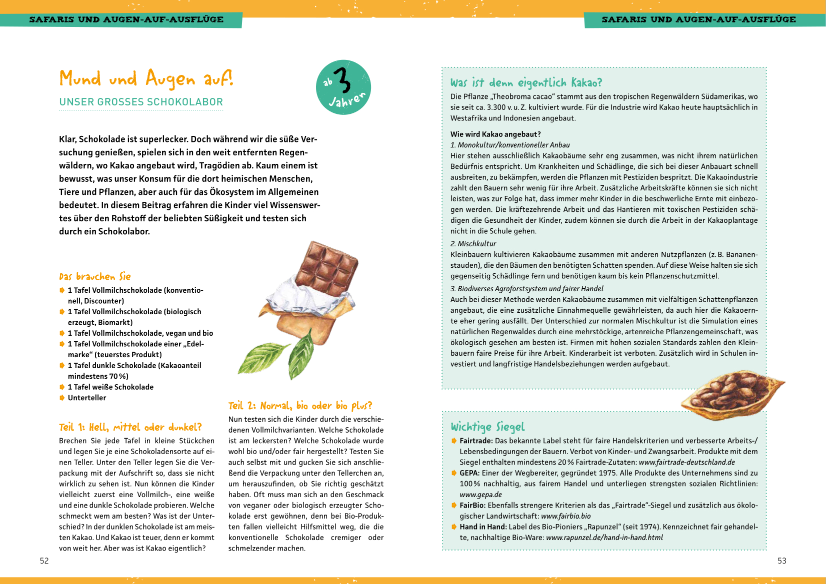 Mit vielen Experimenten, Safaris und Rezeptideen lernen die Kinder in der Kita spielerisch: wieso Fleischessen unser Klima beeinflusst, dass saisonale und regionale Lebensmittel zuallererst auf den Teller landen sollten und worauf es bei der nachhaltigen Ernährung noch ankommt.